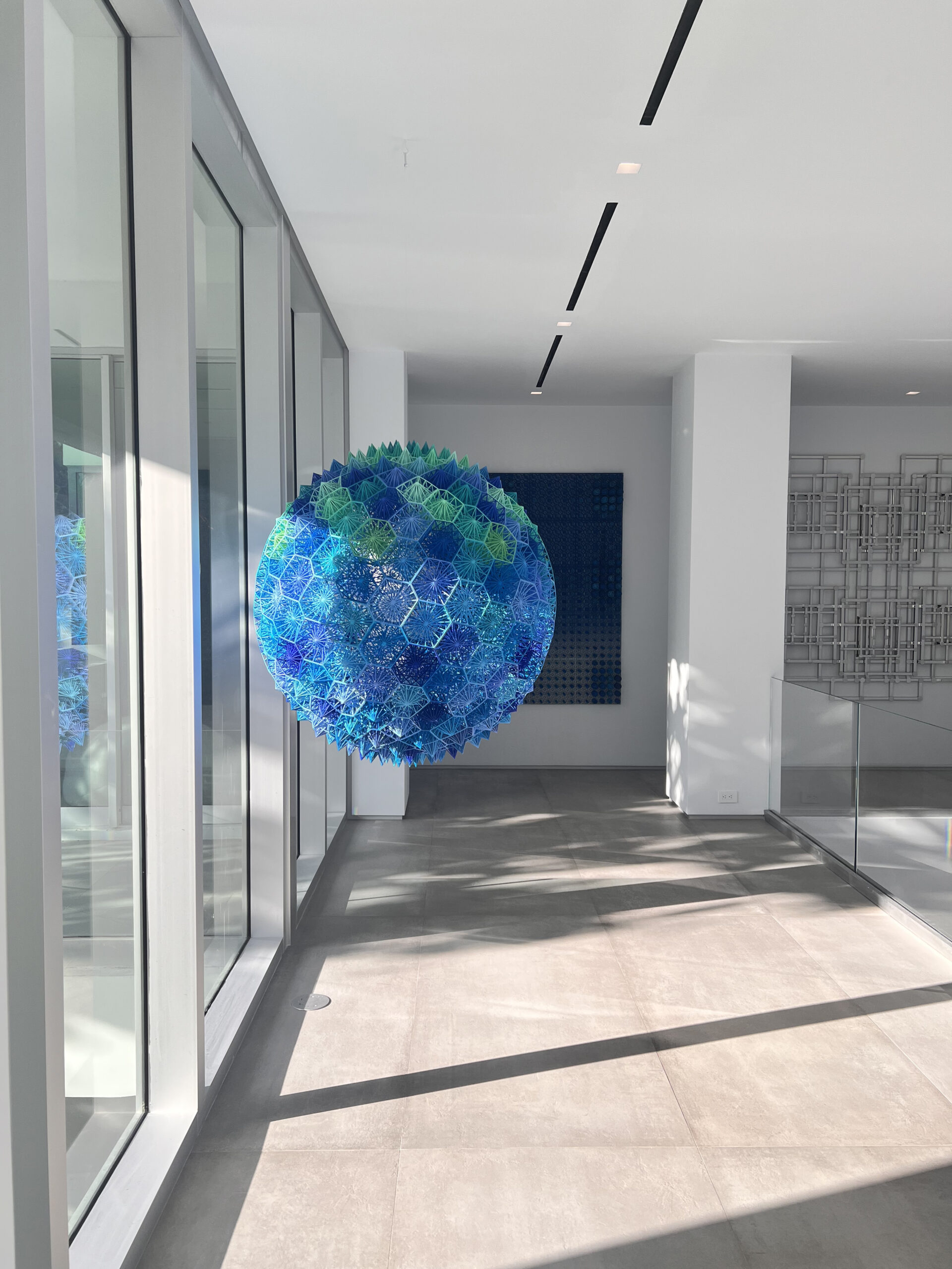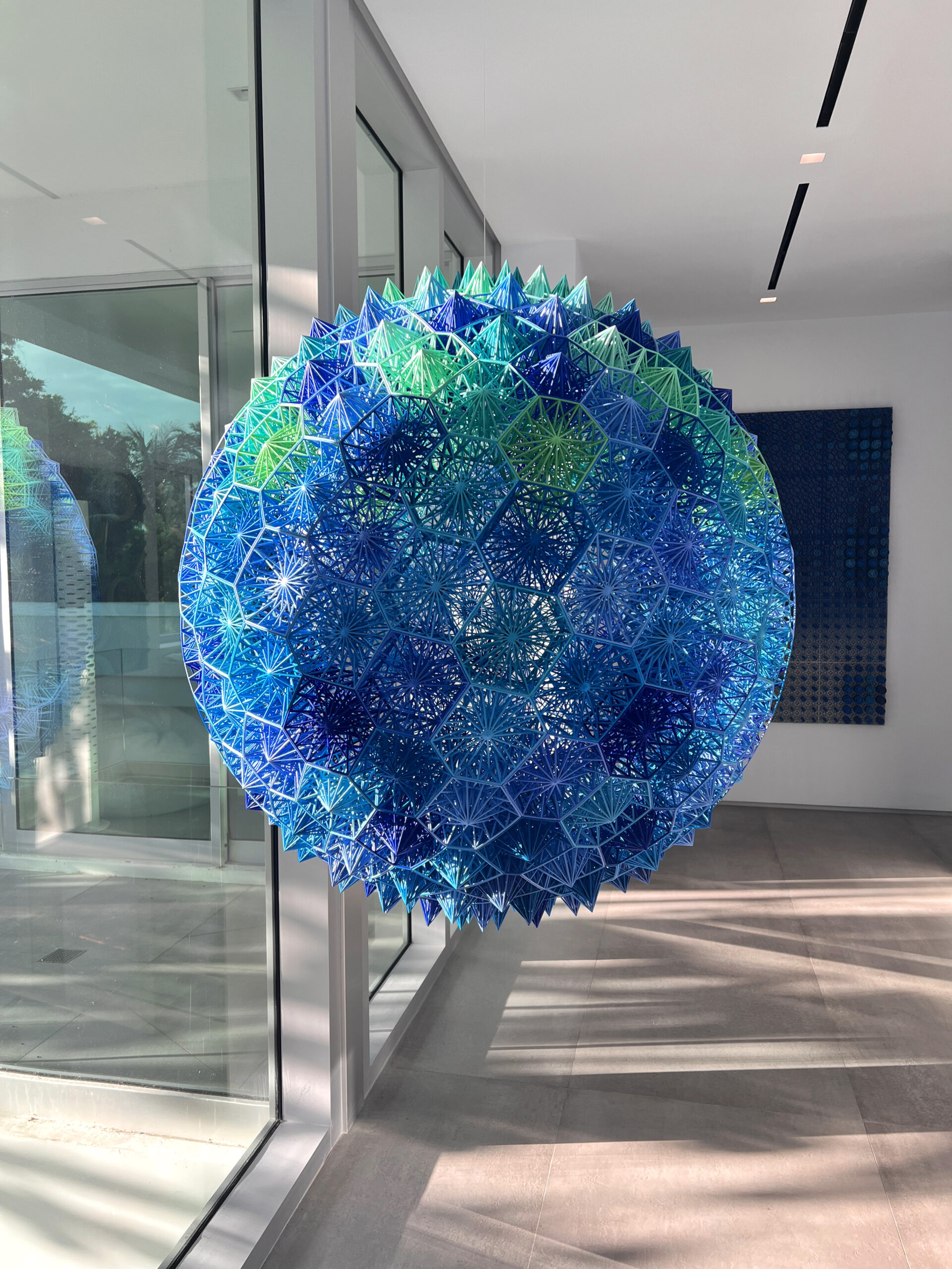 Suspended like a floating planet, “Cosmos” is a 42-inch wide by 45-inch high “Wire Art” sculpture that fuses the mathematics of Fibonacci spirals with Voronoi geometry. Hundreds of hand-assembled, polygonal cells interlock to form a luminous globe alive with depth and light.