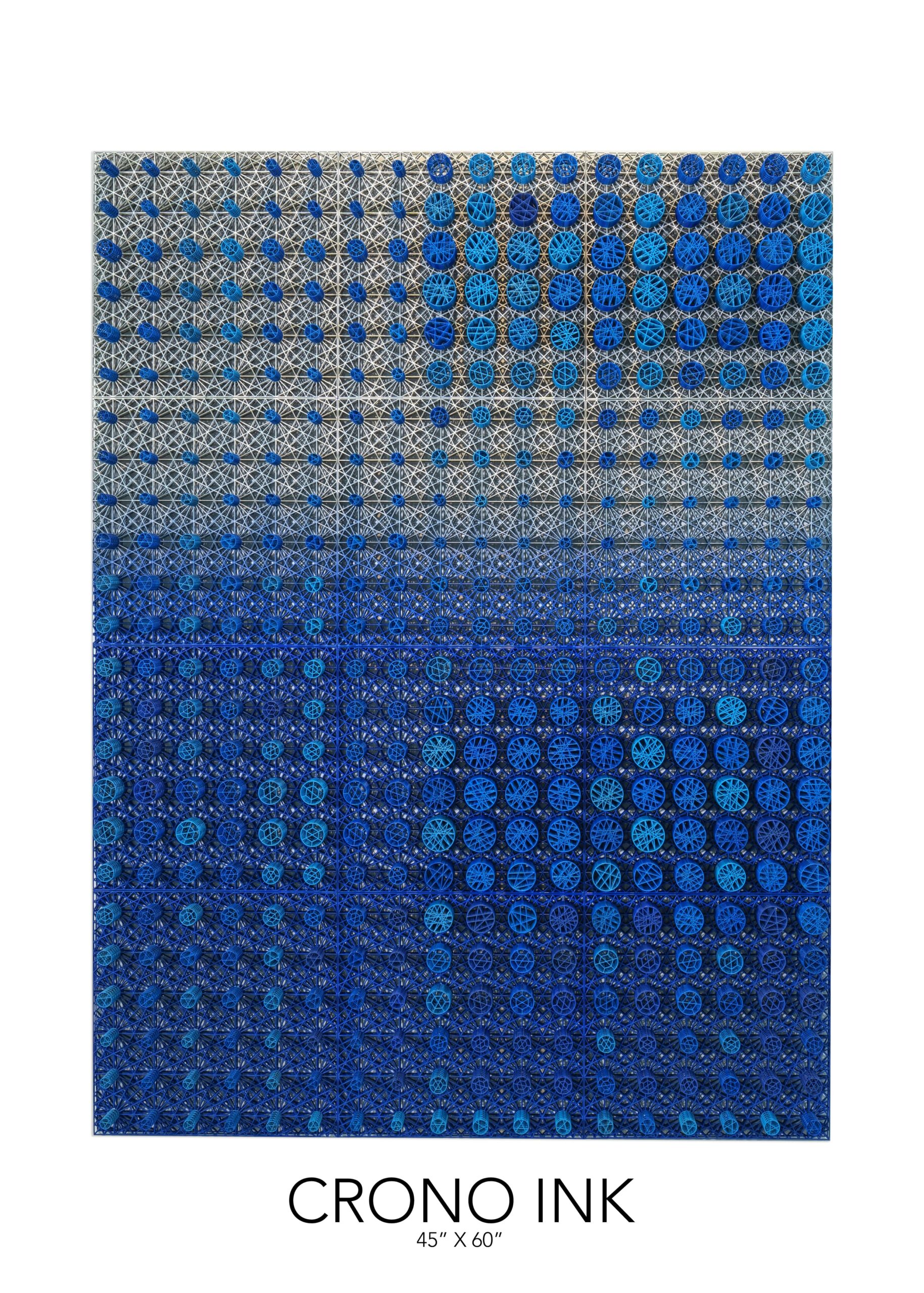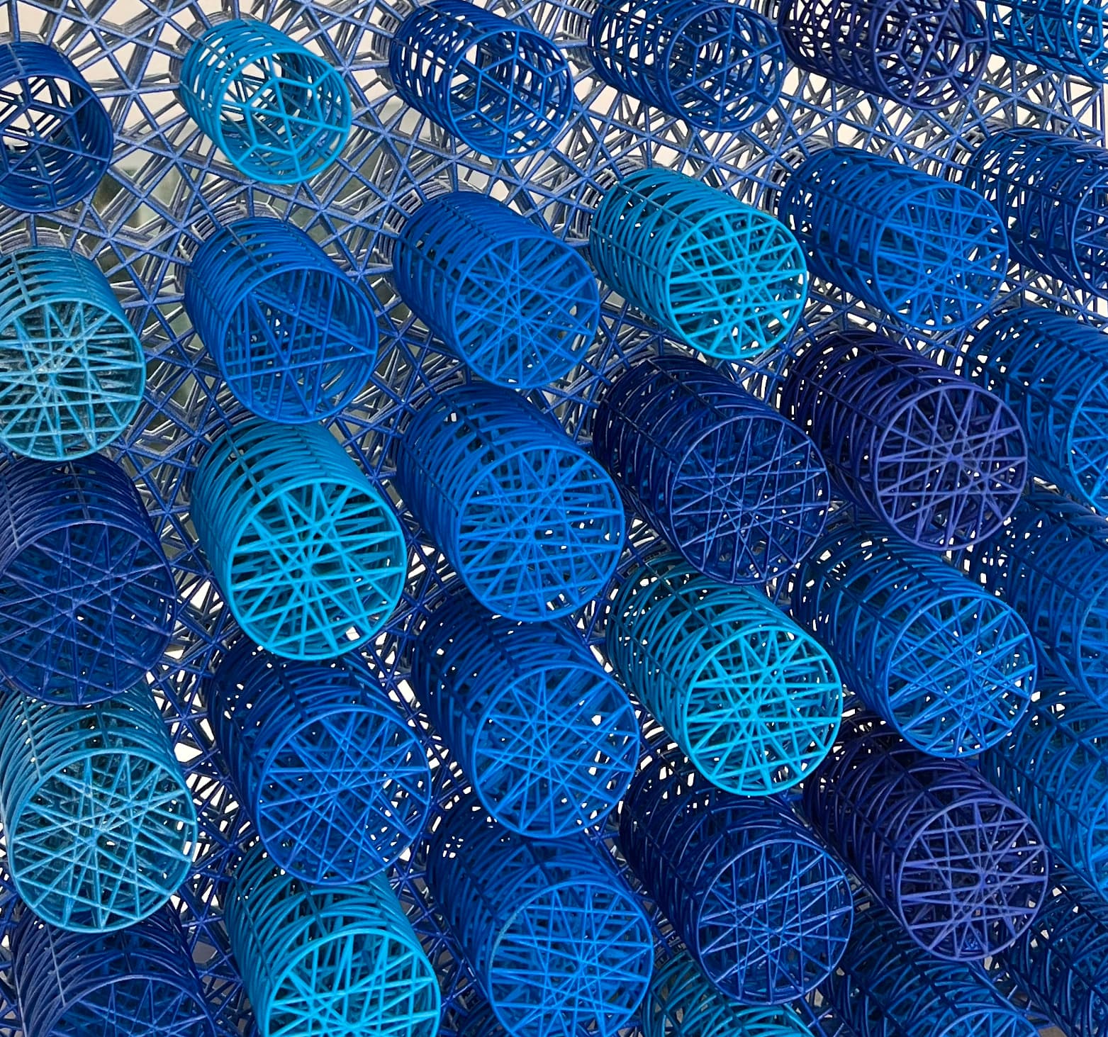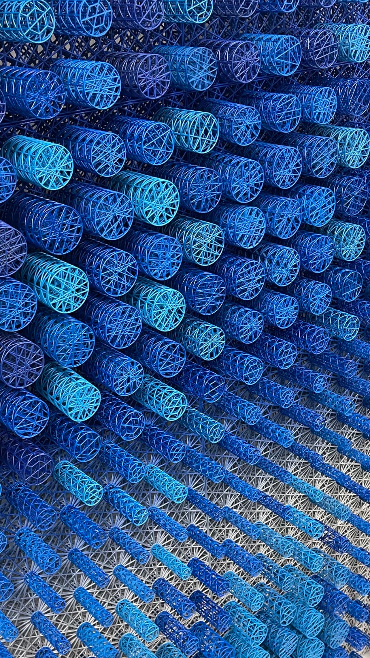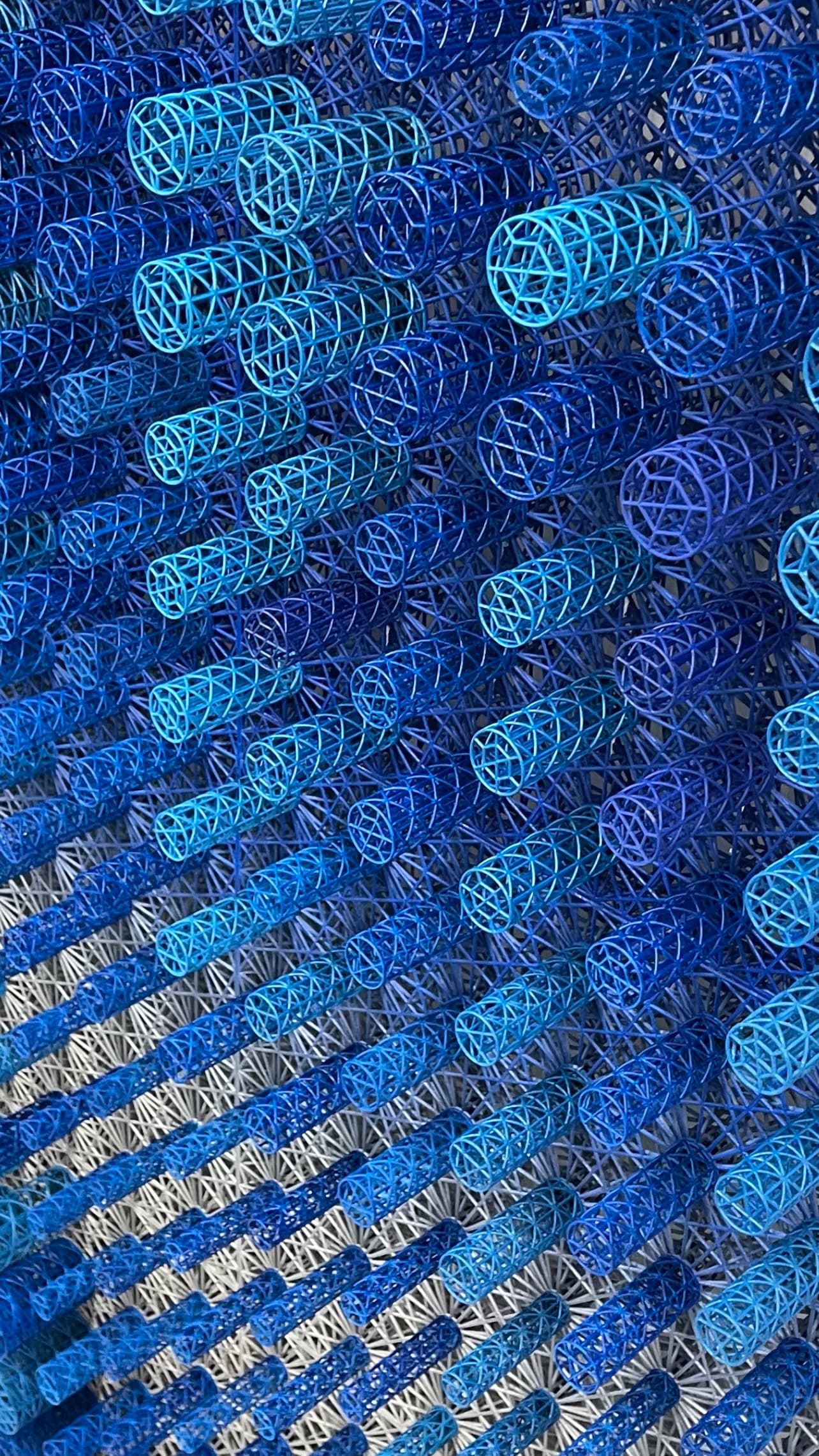 The “Crono Ink Wire Art” wall sculpture is an impressive showcase of 3D-printed geometric complexity, measuring 45″ x 60″ with a 4″ depth. The piece is meticulously crafted from a series of wire lattices, formed through advanced geometric algorithms. The resulting design features an array of cylindrical, lattice-like forms that project outward from the wall, creating a stunning visual texture and depth.