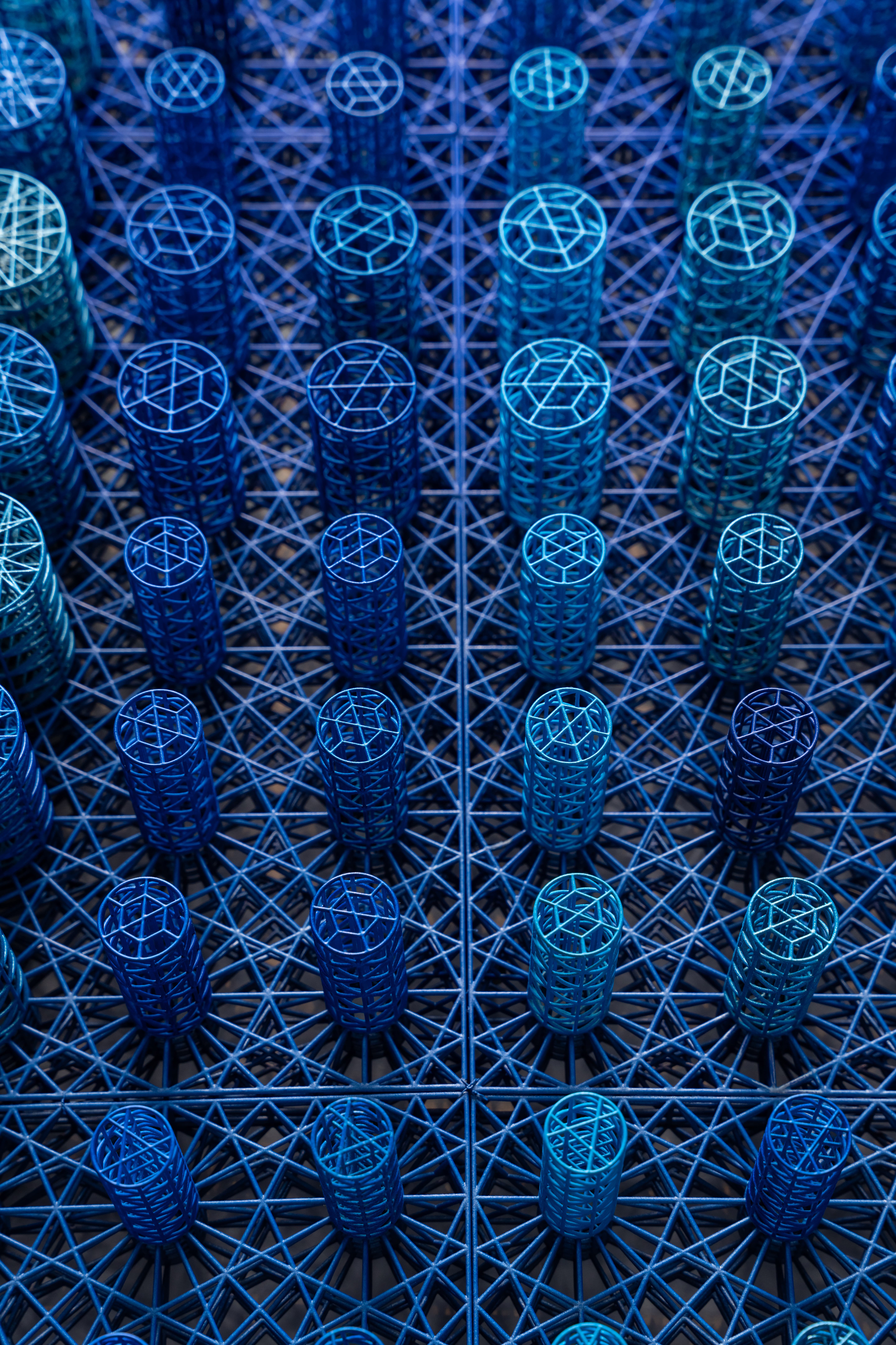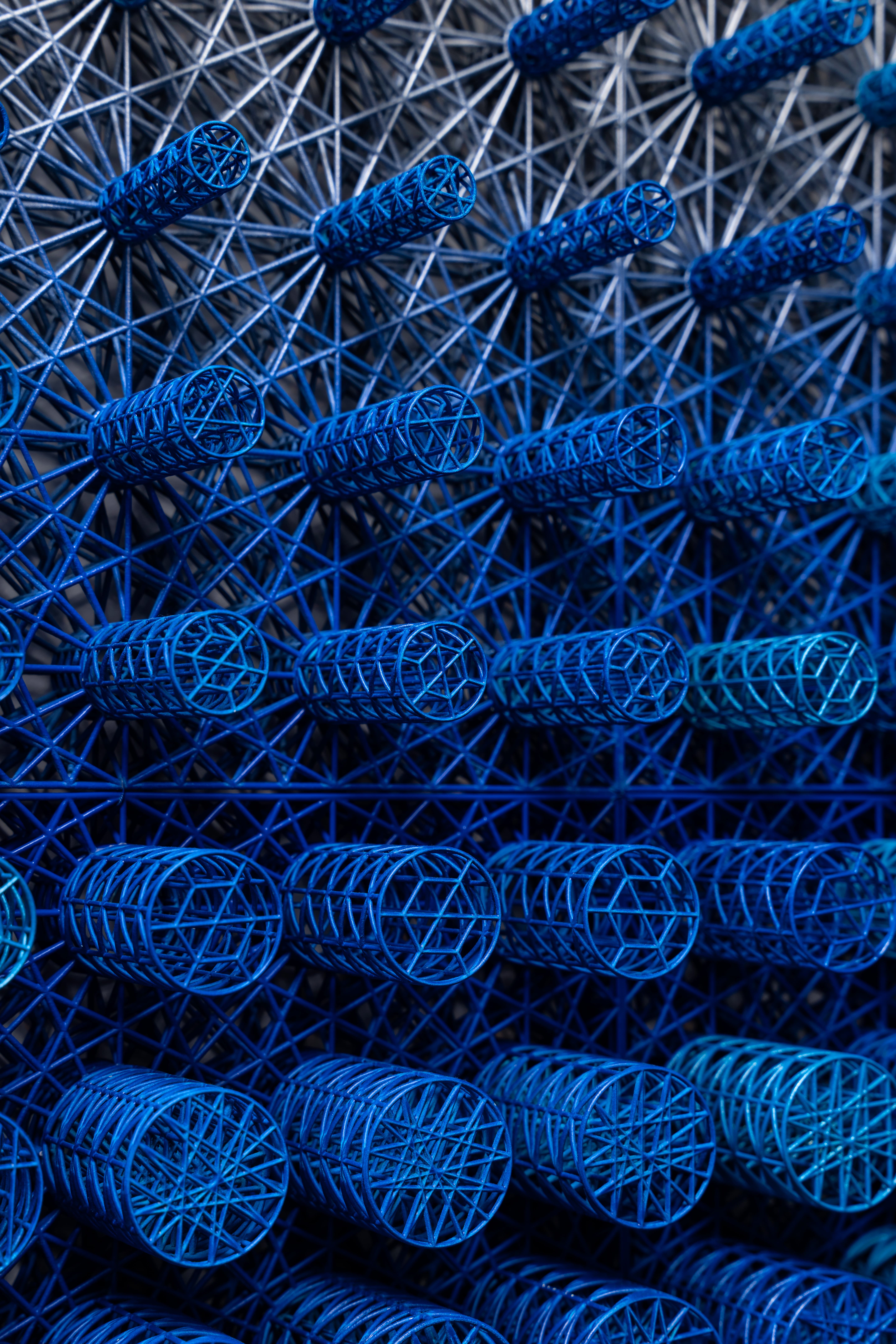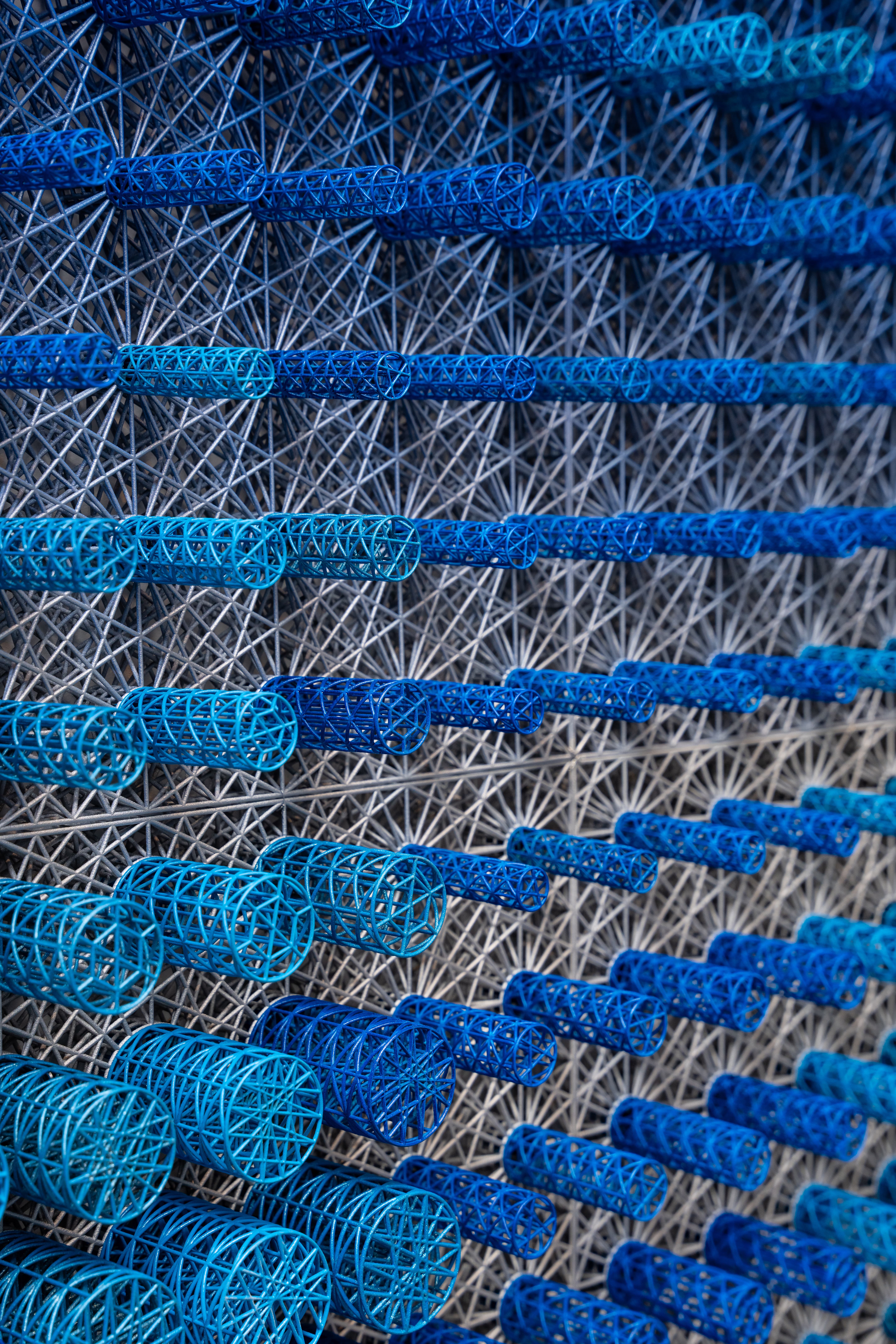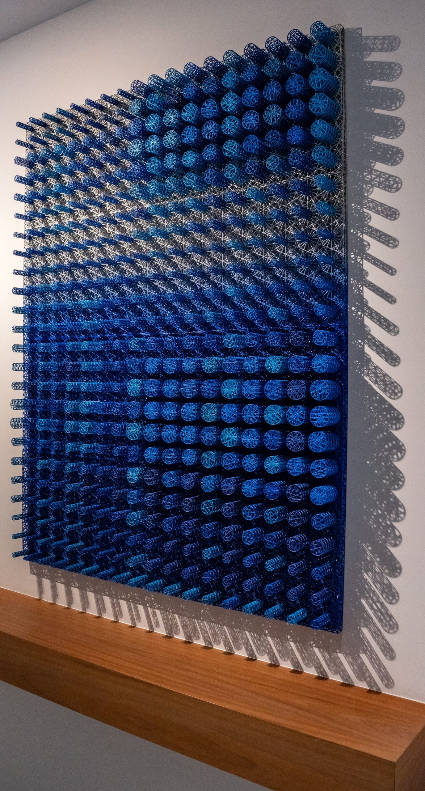 The “Crono Ink Wire Art” wall sculpture is an impressive showcase of 3D-printed geometric complexity, measuring 45″ x 60″ with a 4″ depth. The piece is meticulously crafted from a series of wire lattices, formed through advanced geometric algorithms. The resulting design features an array of cylindrical, lattice-like forms that project outward from the wall, creating a stunning visual texture and depth.