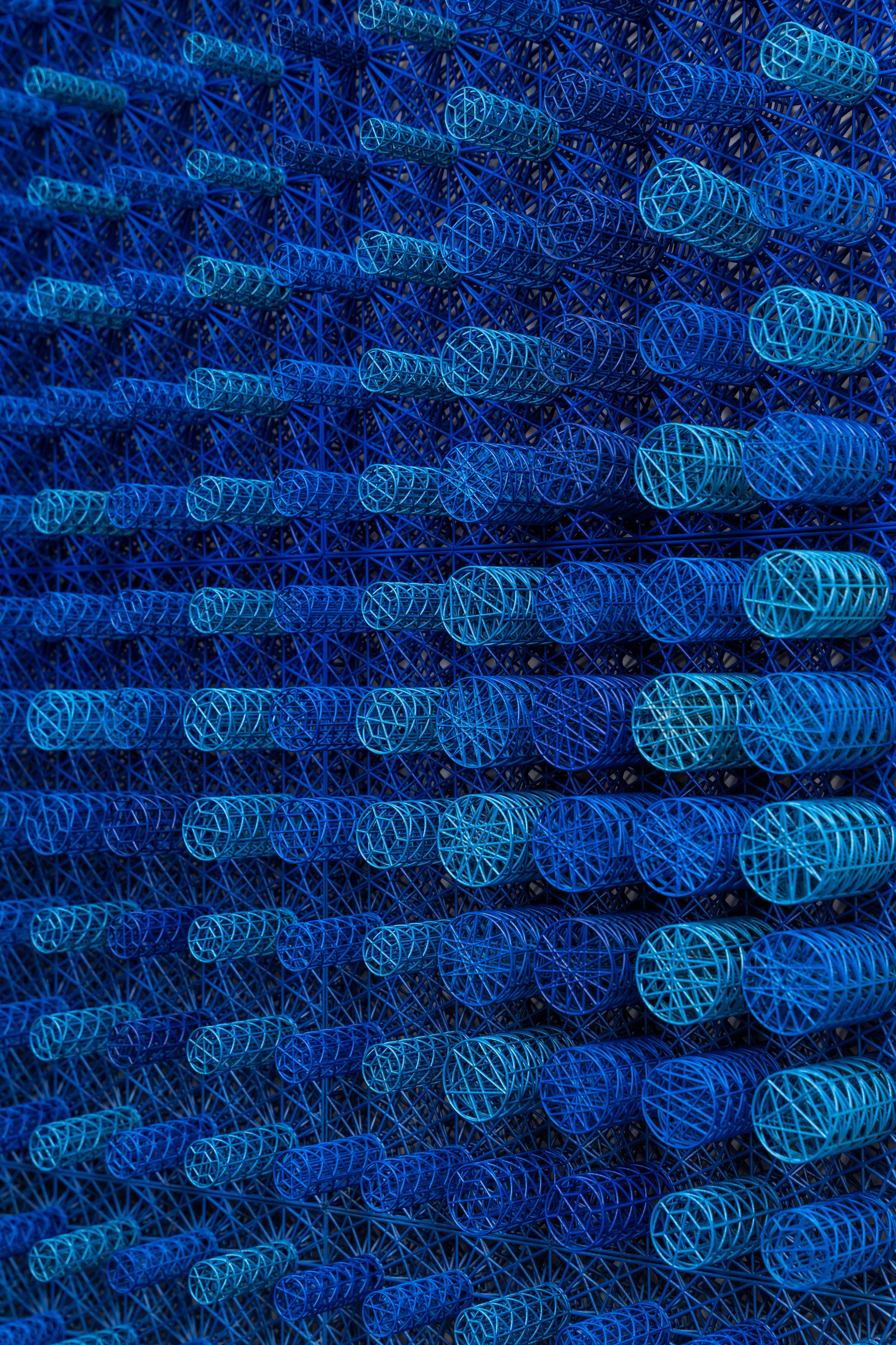 The color palette of the “Crono Ink Wire Art” sculpture is dominated by rich, deep blues, from vibrant azure to dark indigo, punctuated by lighter, translucent shades of aqua. This gradation of color is both soothing and dynamic, evoking a sense of fluidity and movement, reminiscent of ink diffusing through water. The interplay of these hues, paired with the precision of the lattice structure, creates a hypnotic visual rhythm that captures attention.