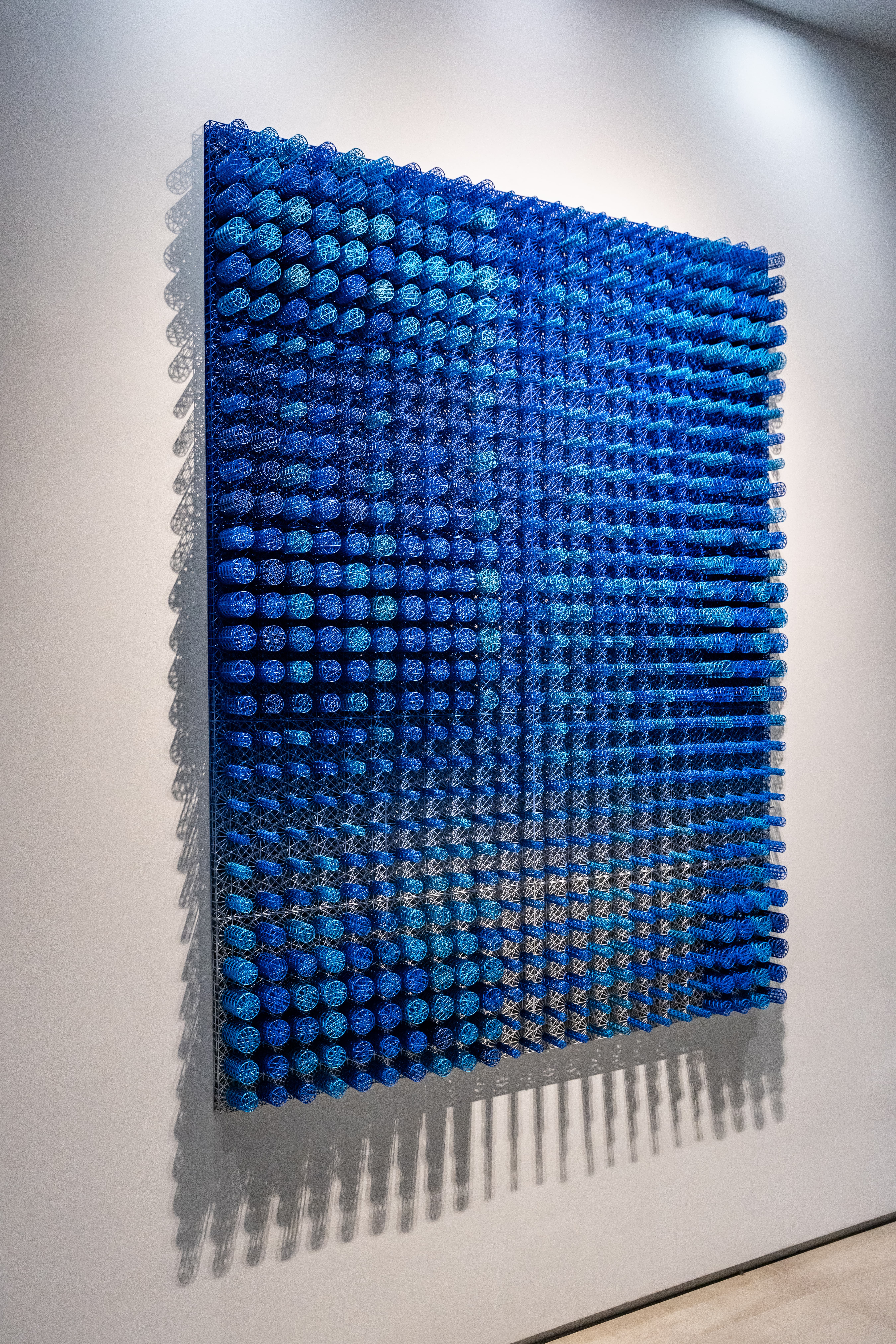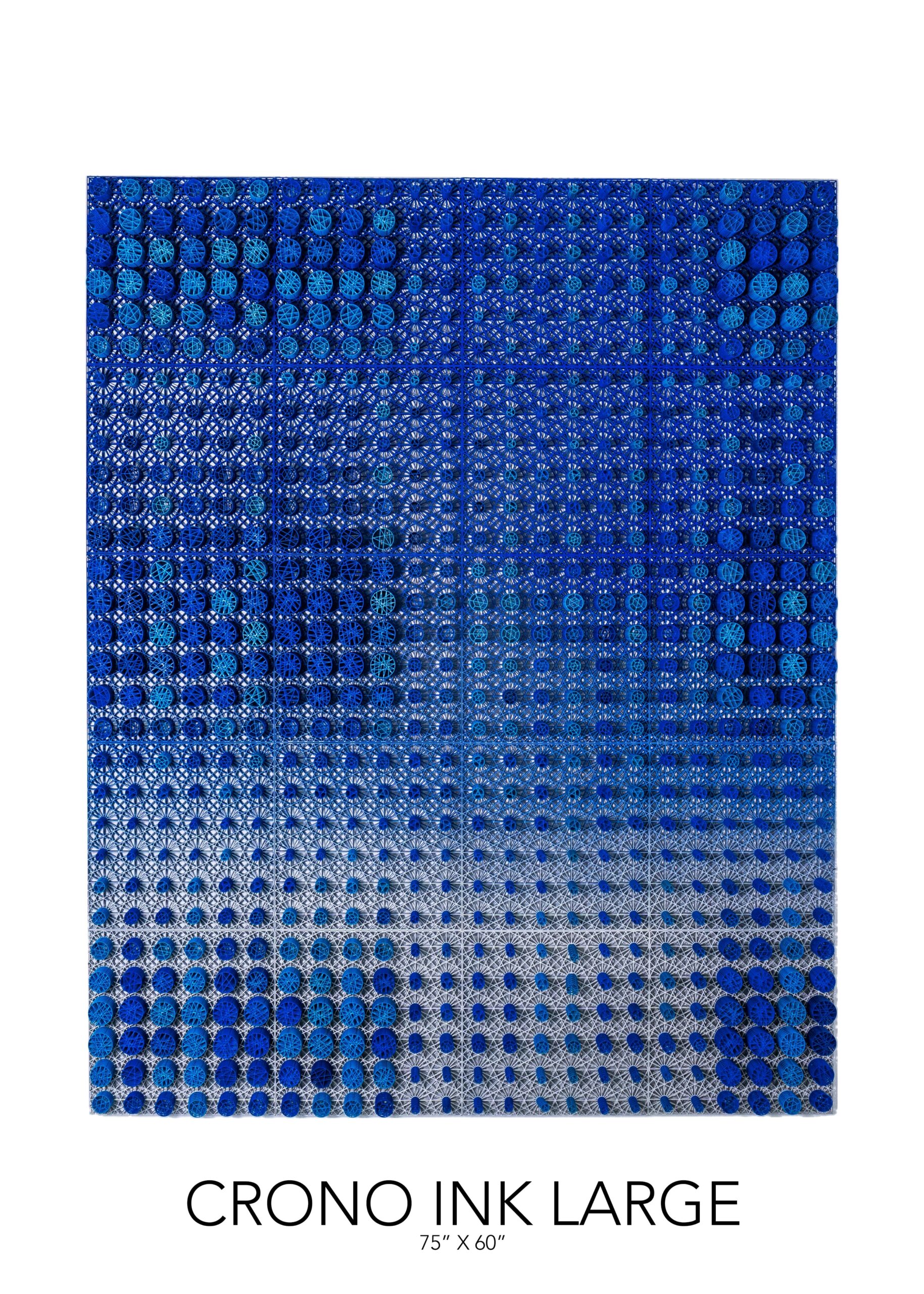 The “Crono Ink Wire Art” wall sculpture is an impressive showcase of 3D-printed geometric complexity, measuring 60” x 75” with a 4″ depth. The piece is meticulously crafted from a series of wire lattices, formed through advanced geometric algorithms. The resulting design features an array of cylindrical, lattice-like forms that project outward from the wall, creating a stunning visual texture and depth.