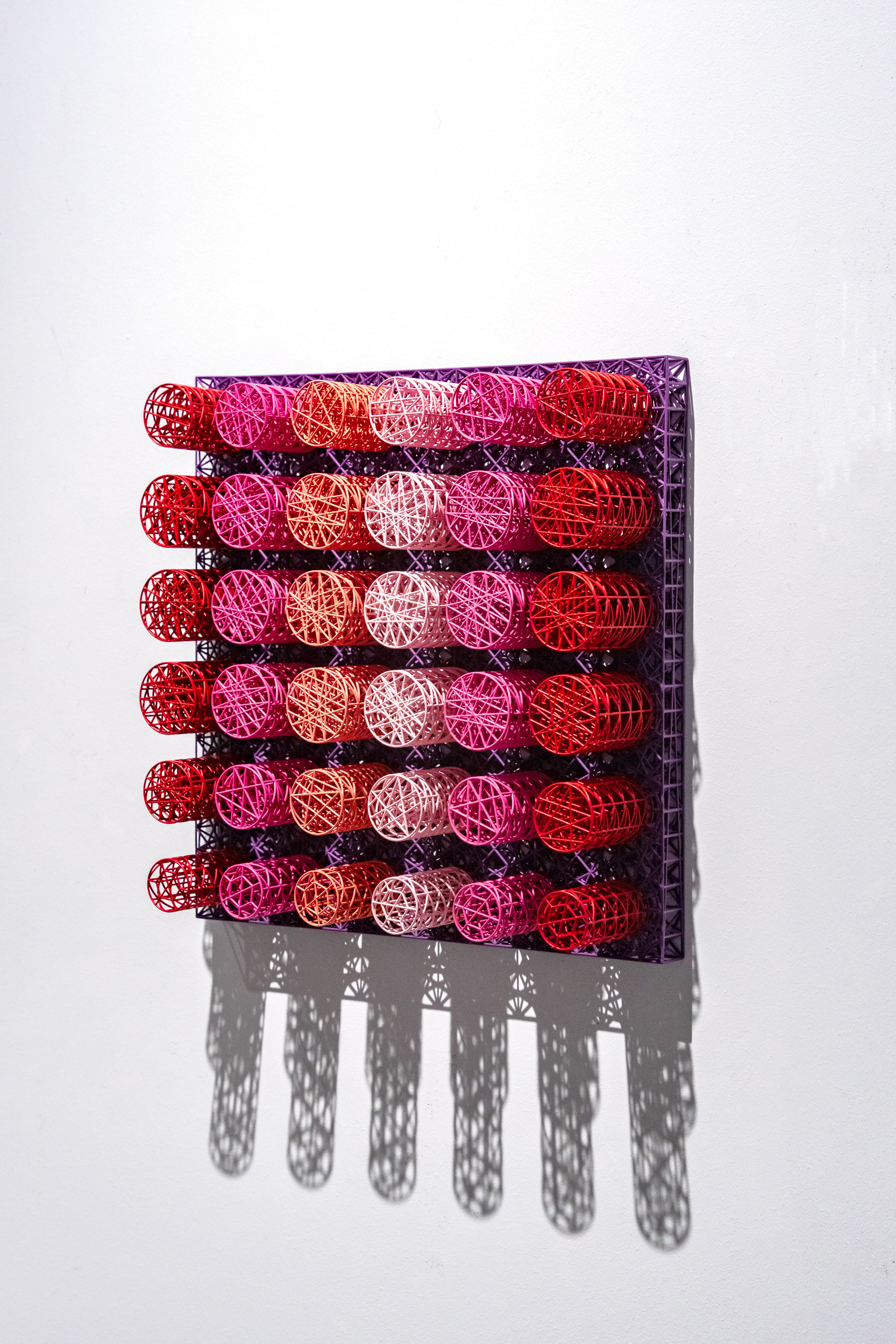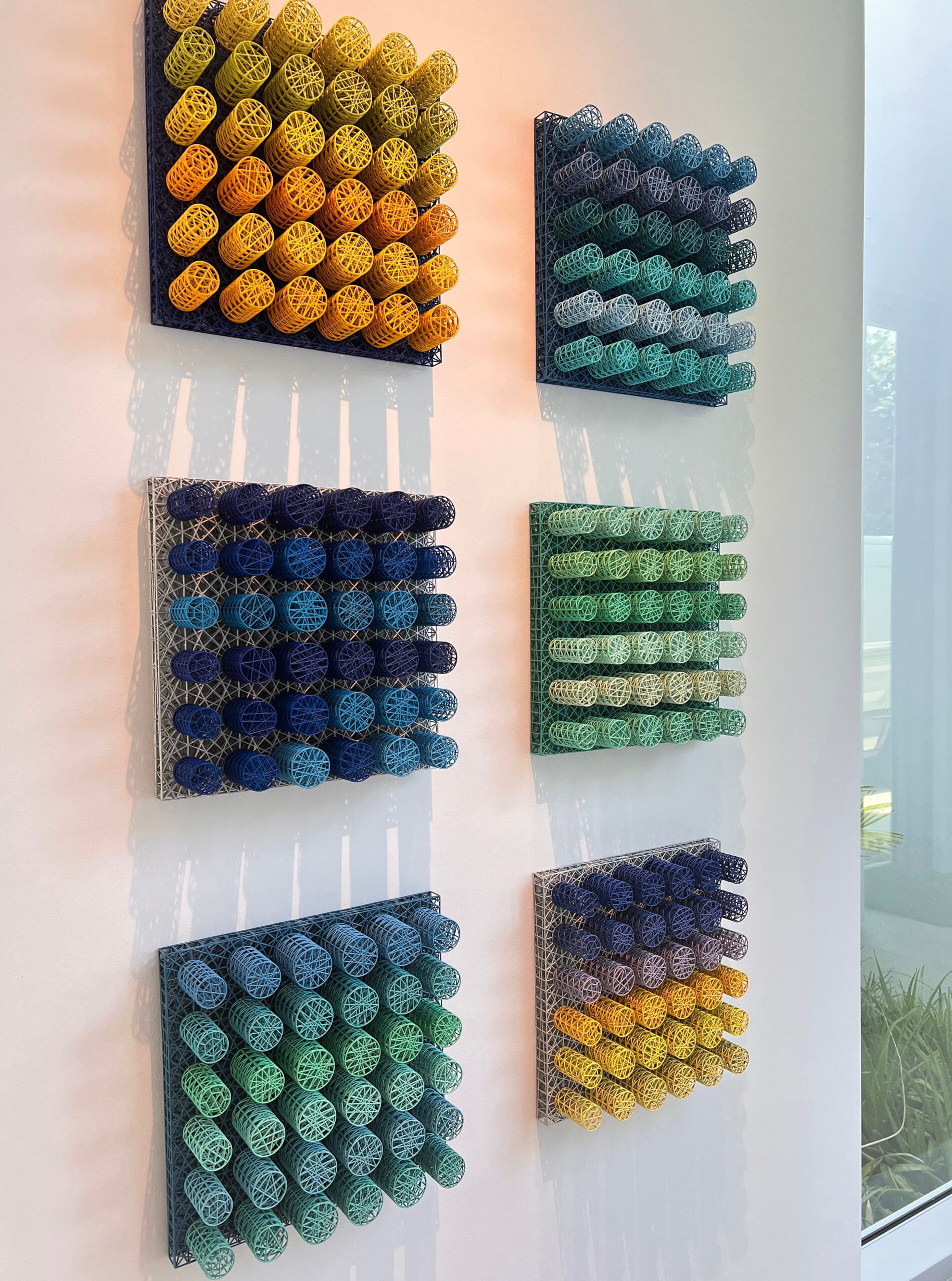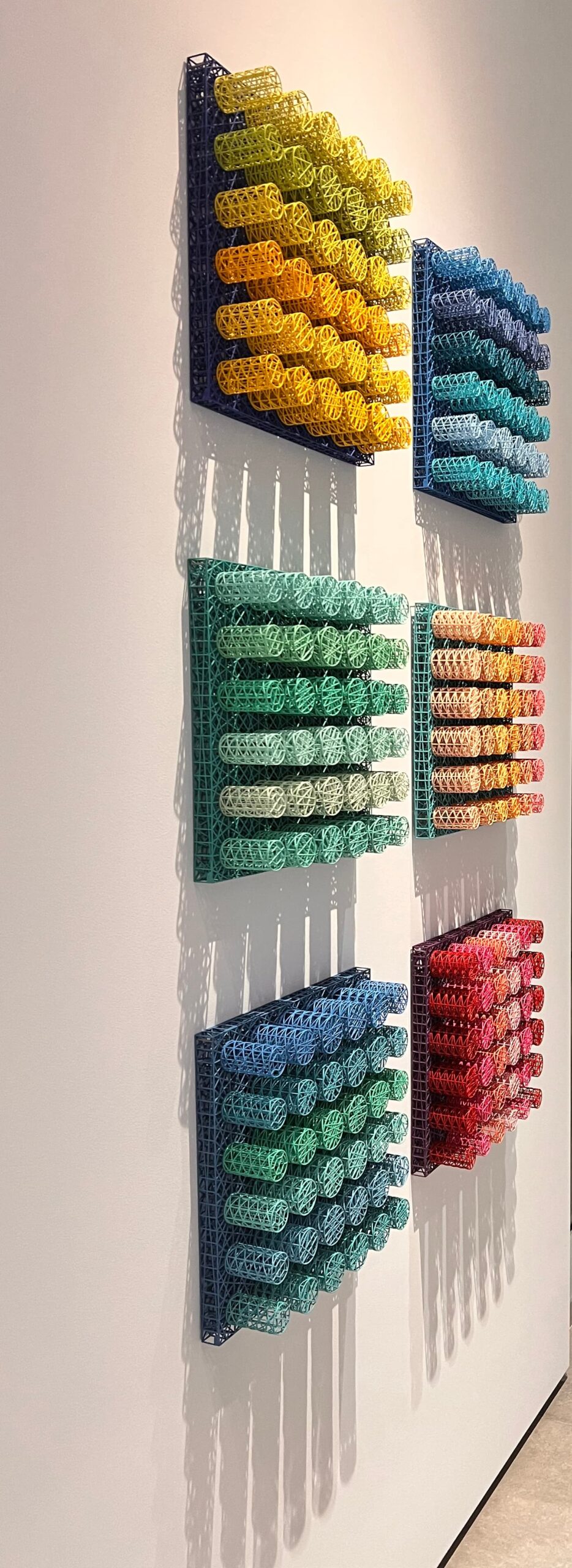 Each piece in the series measures 15″ x 15″ with a 4″ depth, and comes in a vibrant array of colors. The use of color enhances the dimensionality of the forms, with light and shadow interacting across the delicate wire frames, producing subtle gradations in tone and texture. The arrangement of the cylindrical elements invites an exploration of spatial relationships, transforming any installation into an immersive visual experience.