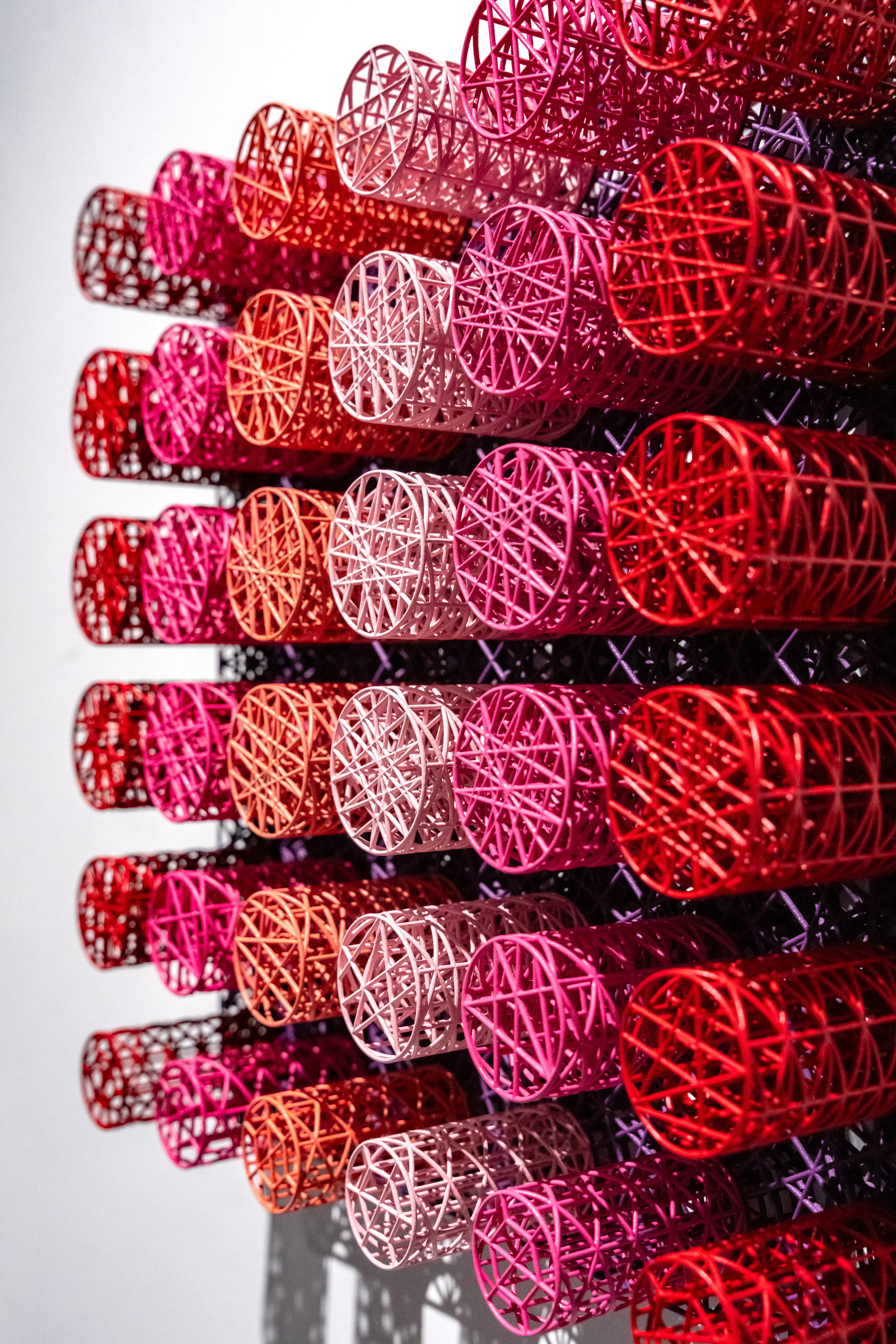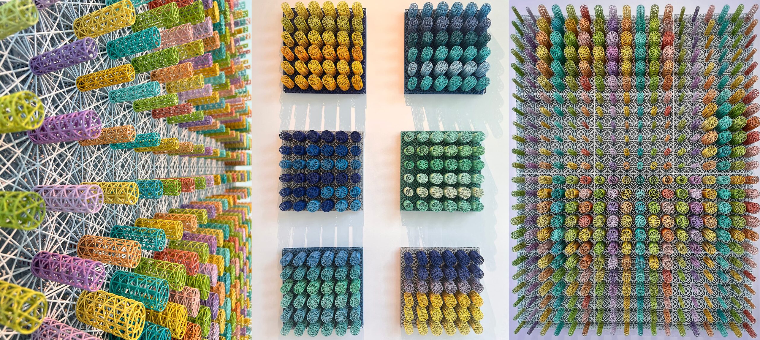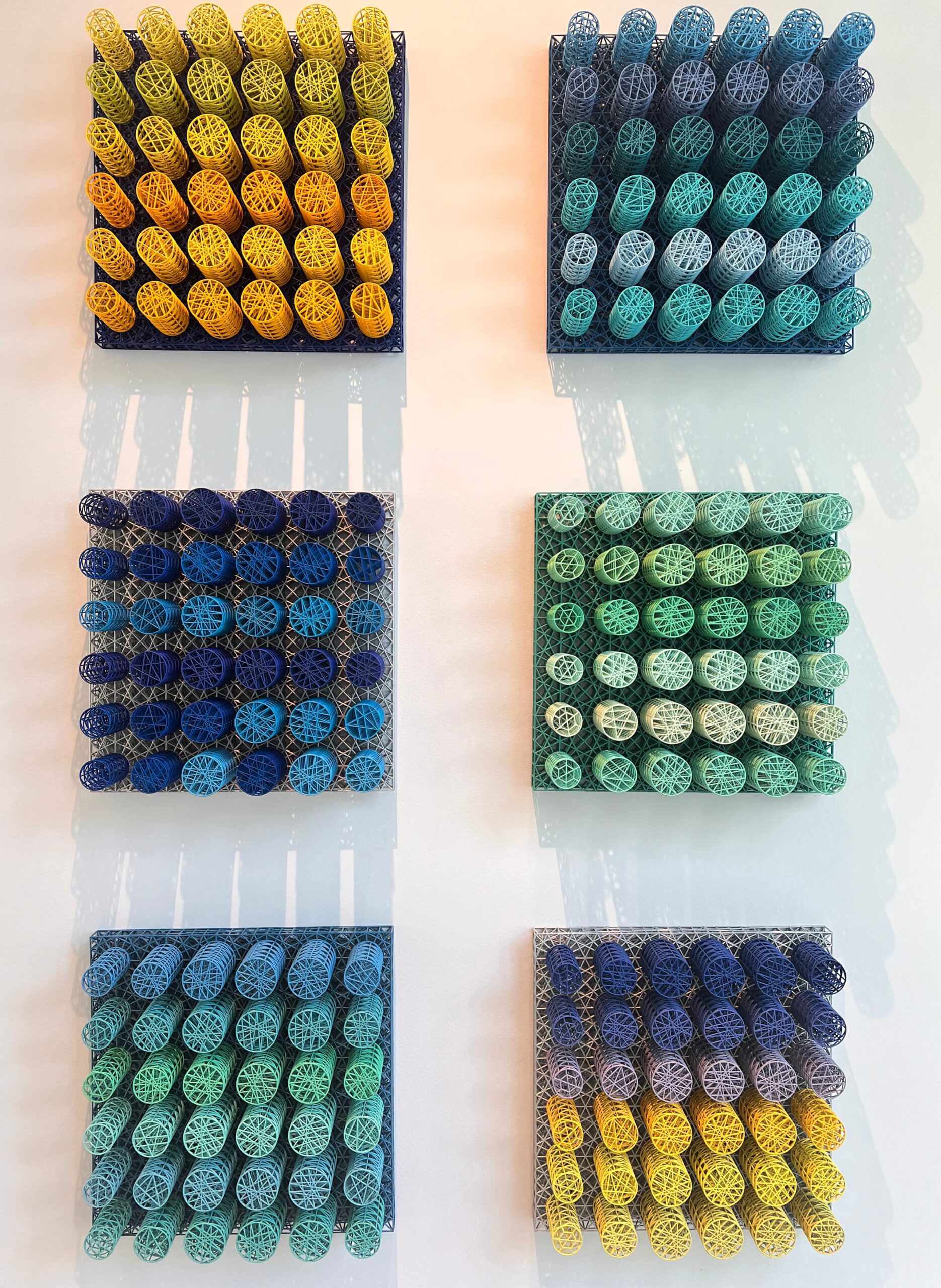 Each piece in the series measures 15″ x 15″ with a 4″ depth, and comes in a vibrant array of colors. The use of color enhances the dimensionality of the forms, with light and shadow interacting across the delicate wire frames, producing subtle gradations in tone and texture. The arrangement of the cylindrical elements invites an exploration of spatial relationships, transforming any installation into an immersive visual experience.