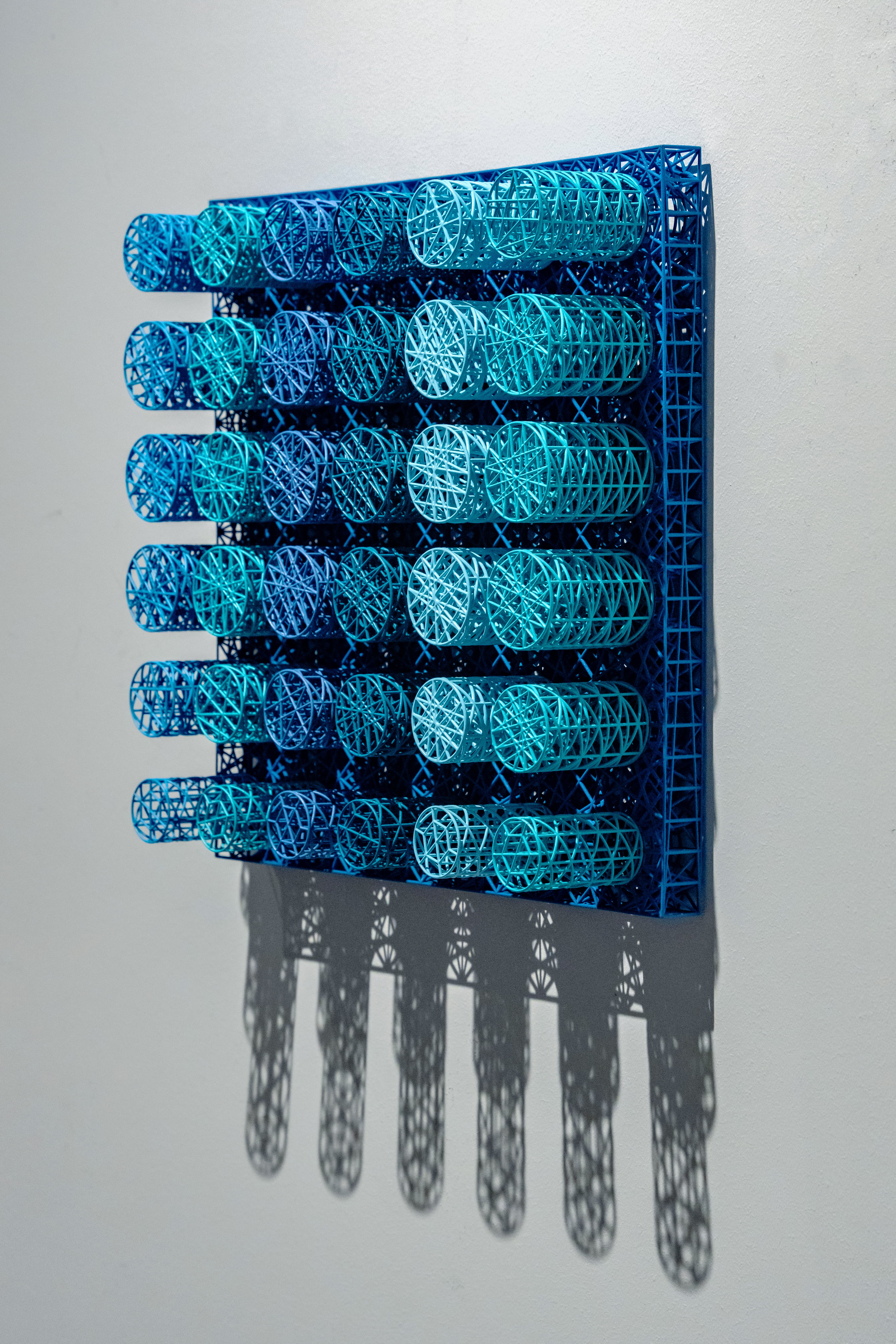 The collection is a dynamic exploration of geometric precision and 3D-printed innovation. Each individual sculpture of “Crono Wire Art” is crafted from intricately designed wire lattices, utilizing advanced geometric algorithms to create a harmonious interplay between form, space, and light. These cylindrical, lattice-like structures extend outward from the wall, projecting both texture and shadow, offering a mesmerizing optical depth that evolves with the viewer’s perspective.