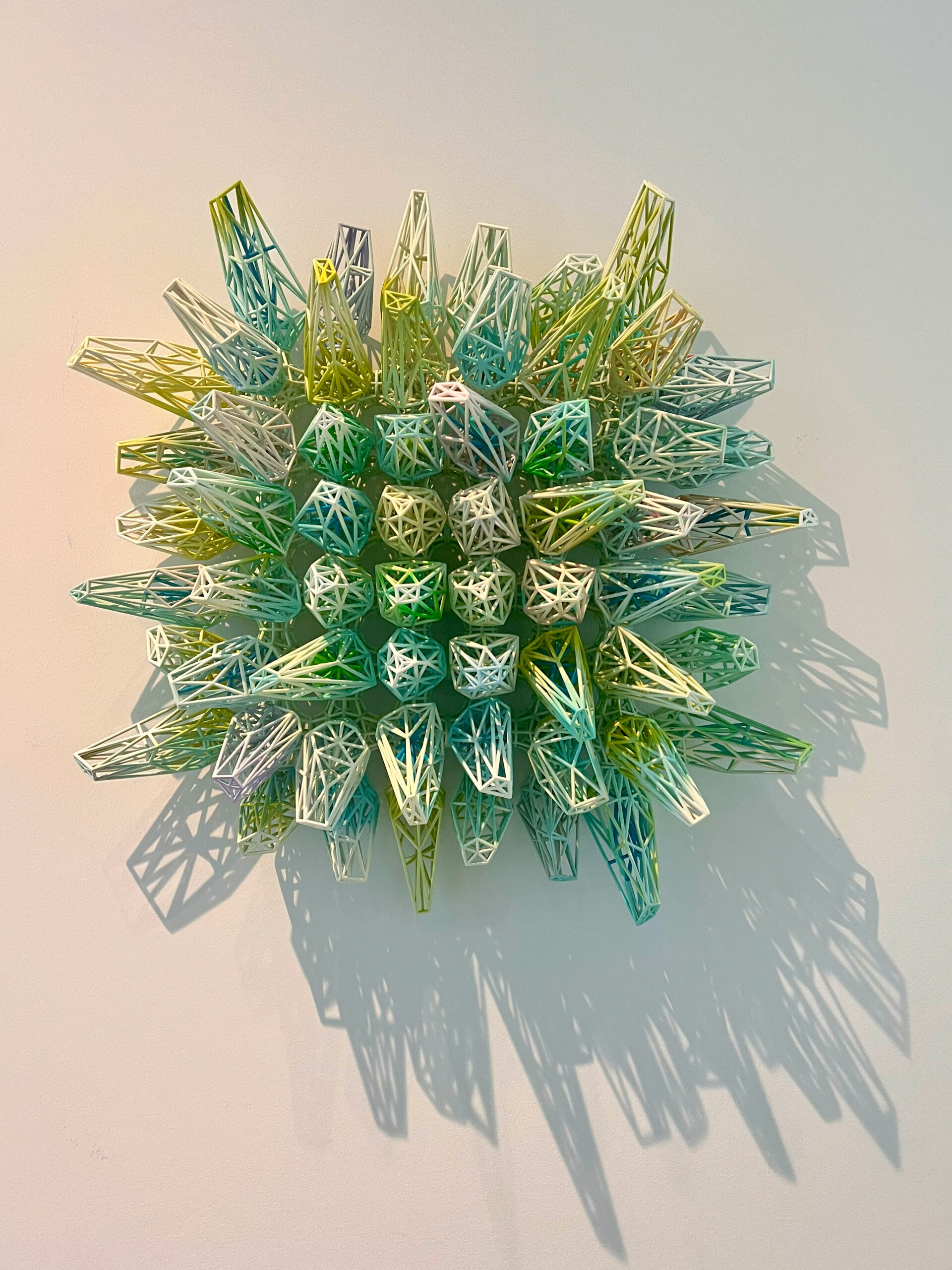 Crystalla Wire Art Wall Sculpture 21” high x 22” wide x 6” deep. This wall-mounted wire sculpture is anchored by a flat backing plane, allowing the form to project decisively forward into space. From this stable surface, an array of crystal-like wire structures emerges, radiating outward in varying lengths and densities. Each projection is built from finely triangulated lattices, giving the appearance of faceted crystals or mineral growths frozen mid-formation. The contrast between the quiet, planar back and the dynamic, three-dimensional front creates a strong sense of depth and forward motion. Softly hand-painted hues of celadon, pale aqua, mint, chartreuse, and ivory move across the latticework, enhancing the sculpture’s mineral and botanical qualities. Light interacts dramatically with the faceted forms, casting complex, shifting shadows that extend the composition beyond its physical edges. The piece balances precision and softness—architectural in structure, yet organic in spirit—suggesting growth, emergence, and calm energy held just beyond the wall.