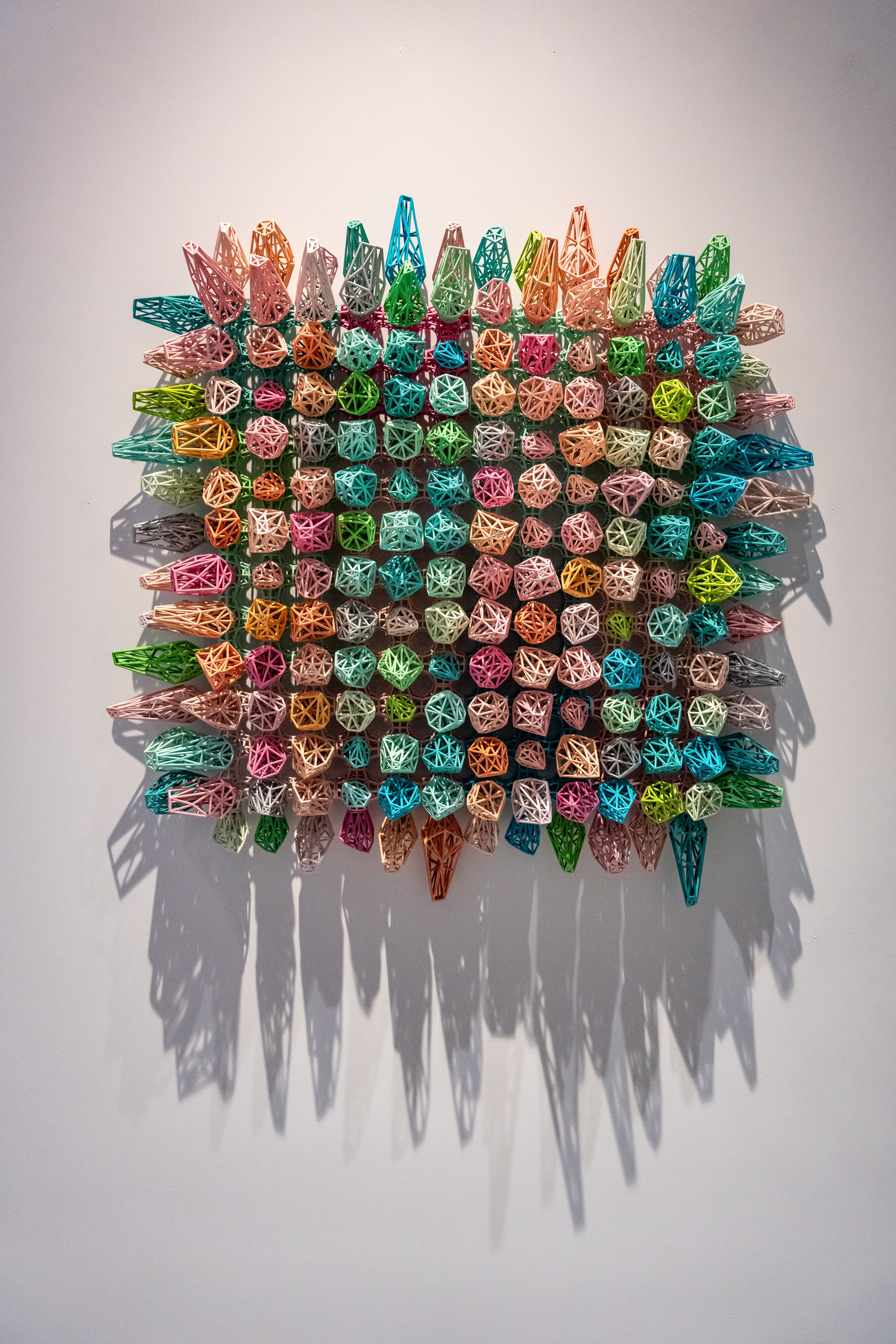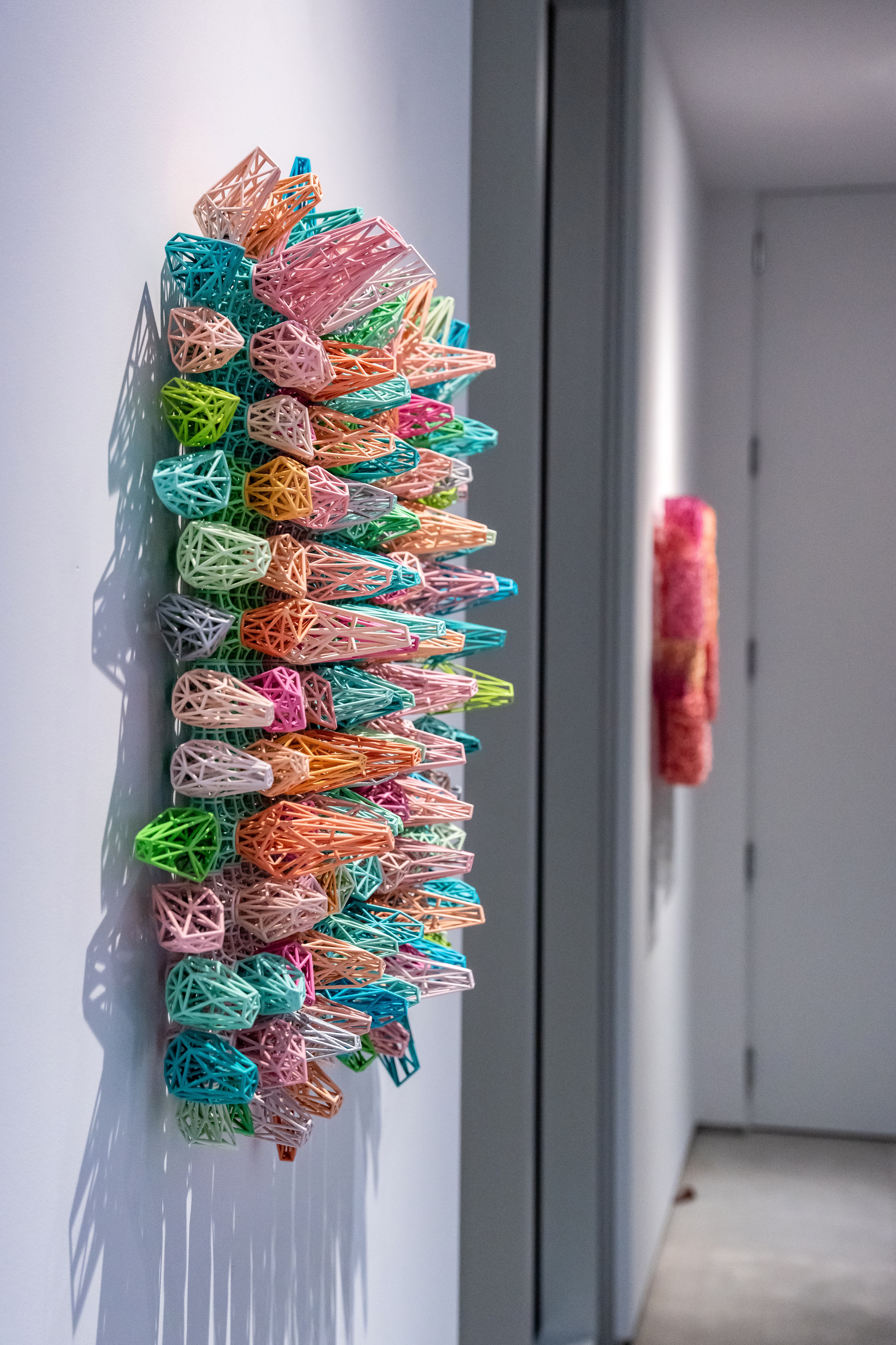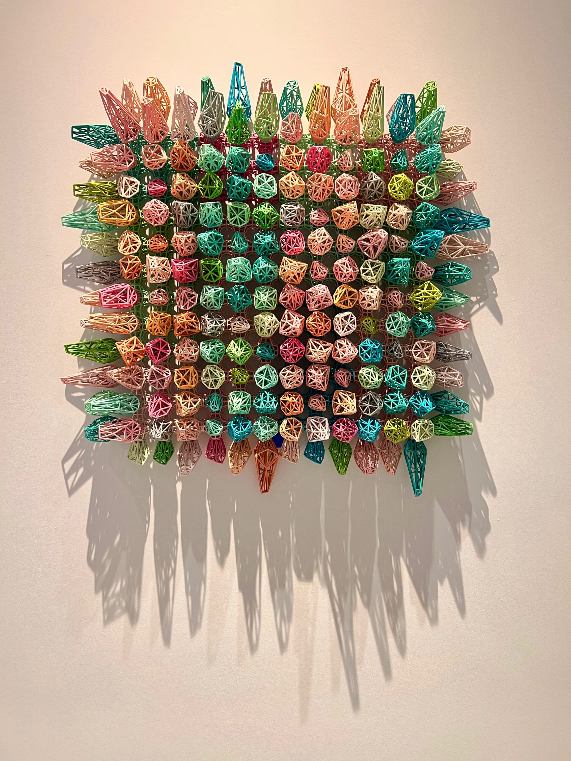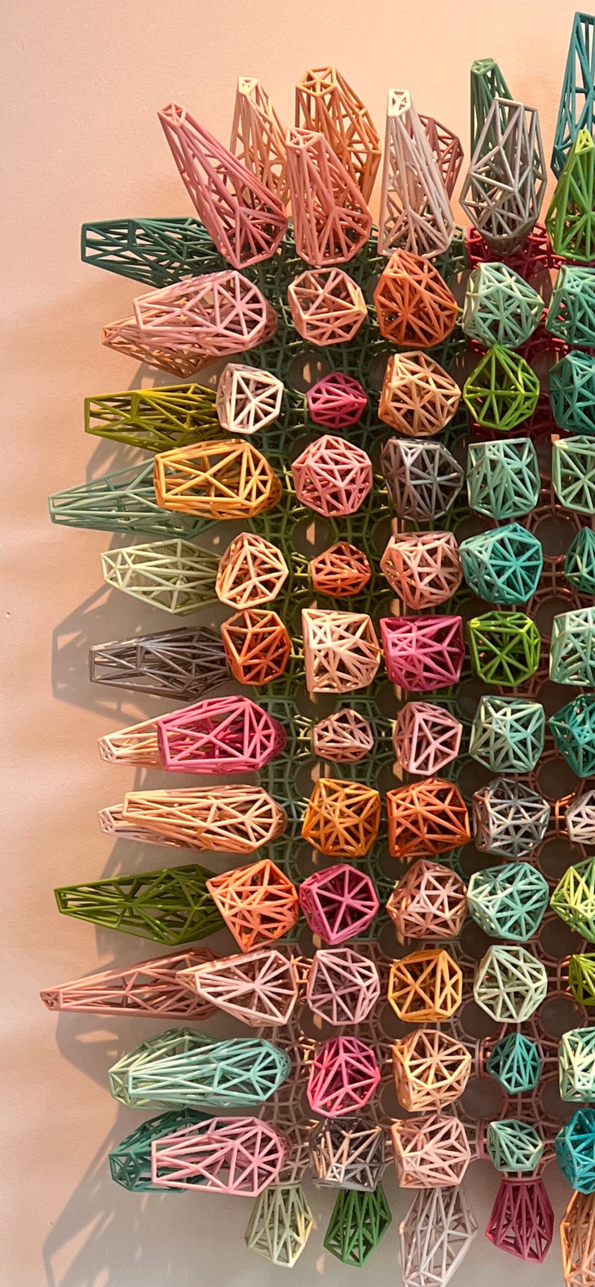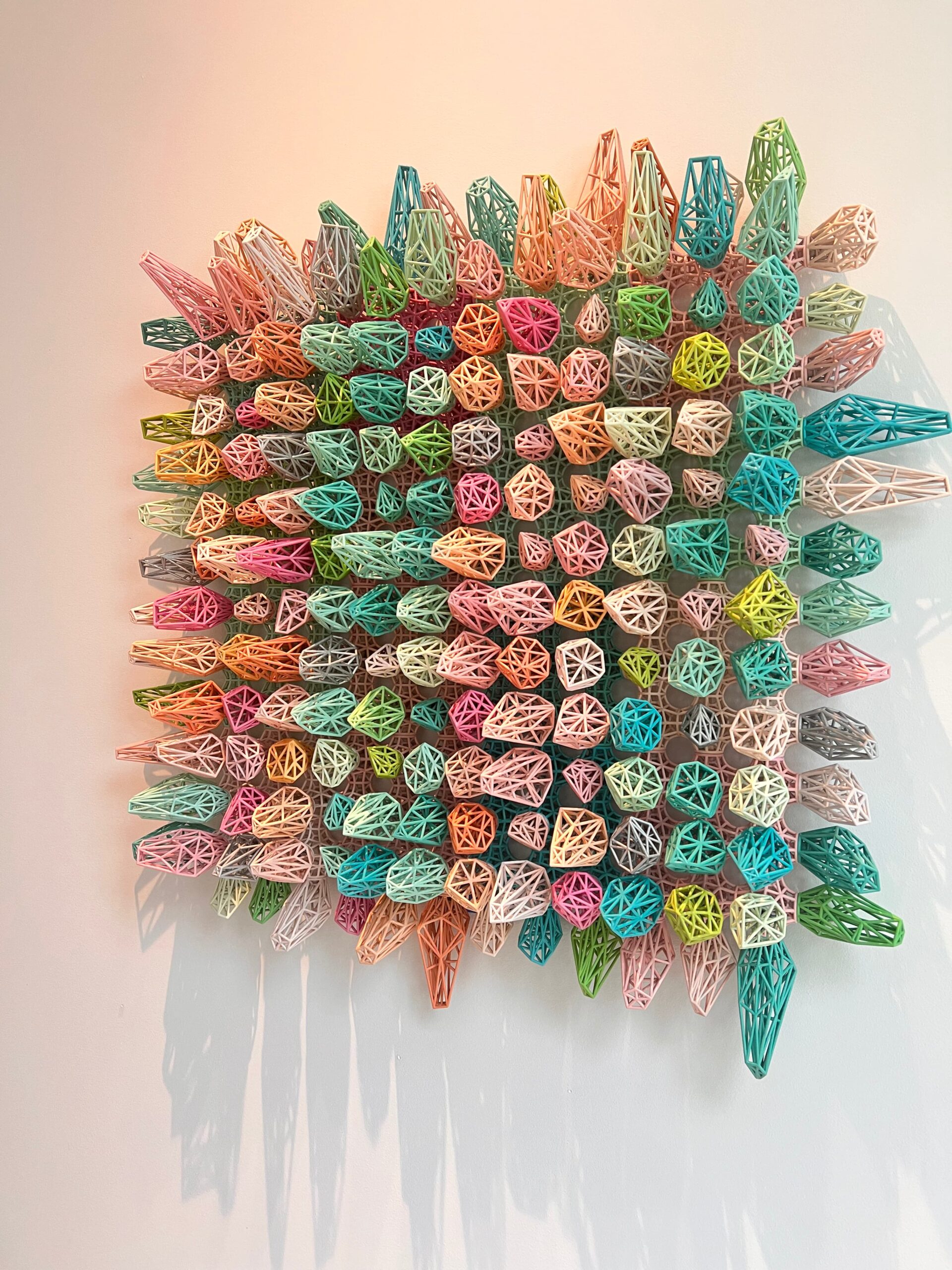 The vibrant and pastel hues range from soft pinks, aquas, greens and peaches, which further emphasize the crystal-like appearance of the forms. The open lattice structure allows light to filter through, casting intricate shadows that contribute to an engaging visual interaction with the piece. The patterns create a unique play of color and shape that changes depending on the viewer’s angle and the light source.