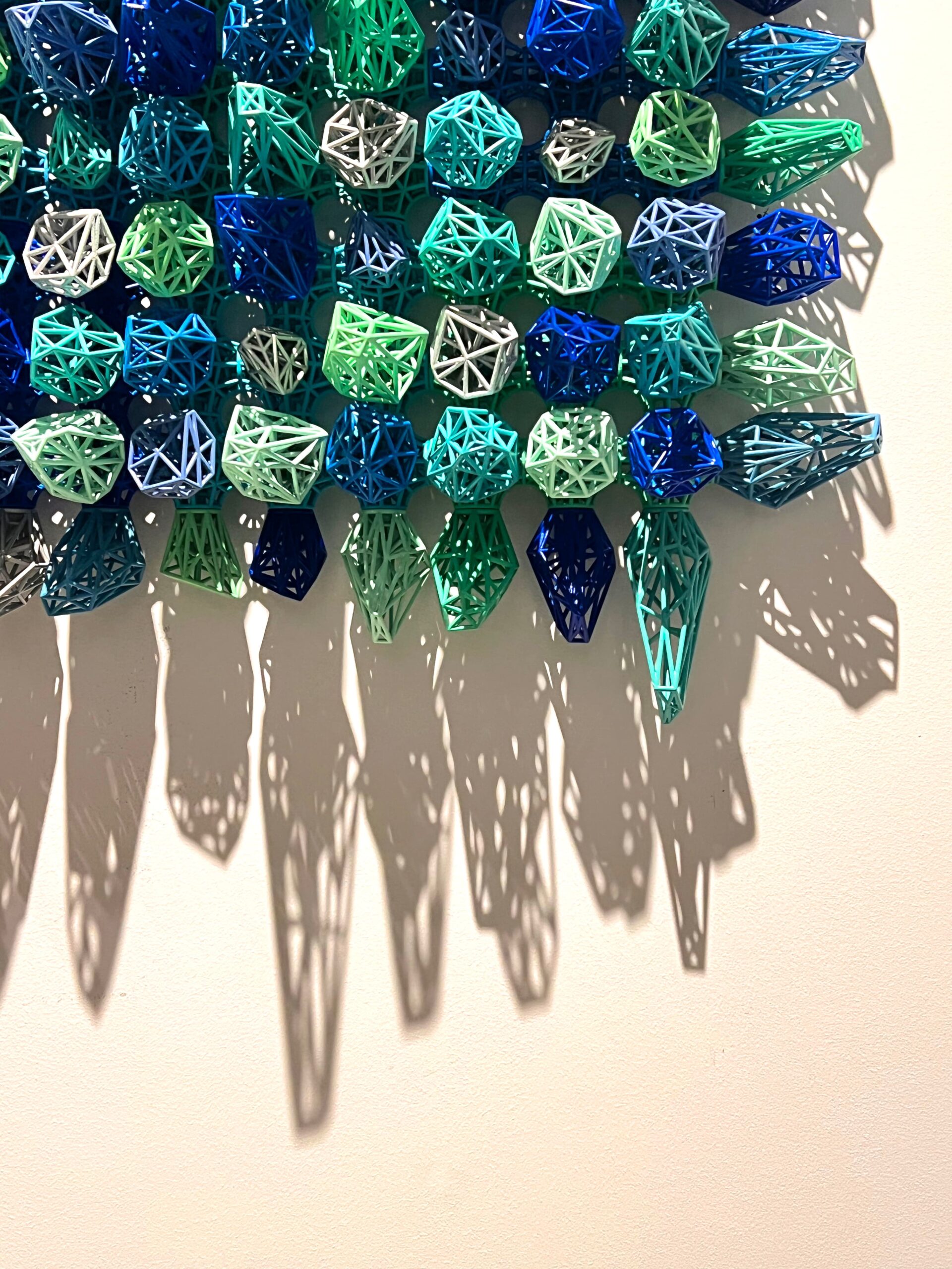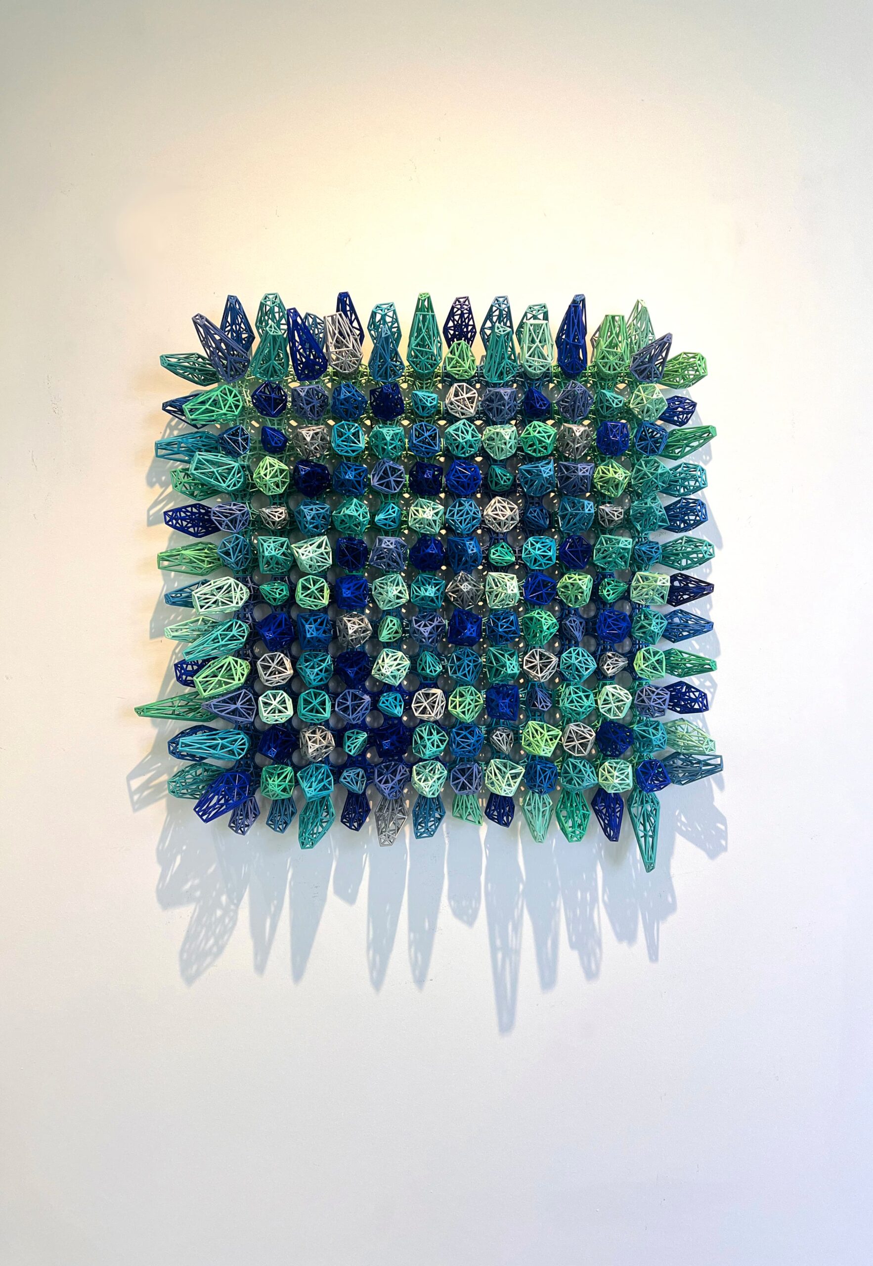 The artwork is composed of numerous crystal and diamond shapes, each crafted from a lattice of wire. These forms are varied in size and orientation, creating a dynamic, almost crystalline landscape. The geometric nature of the shapes is reminiscent of facets on a gemstone, catching and reflecting light in various ways depending on the viewer’s angle.
