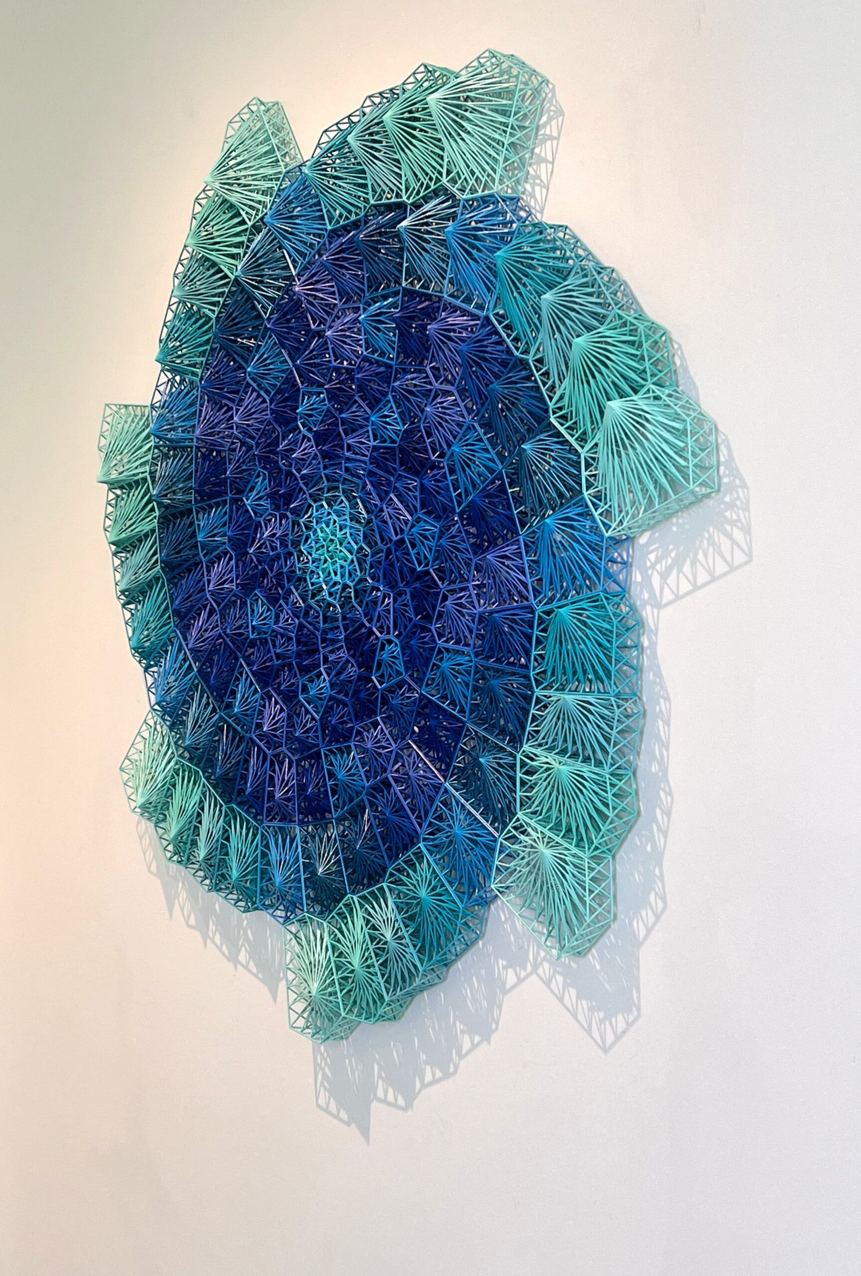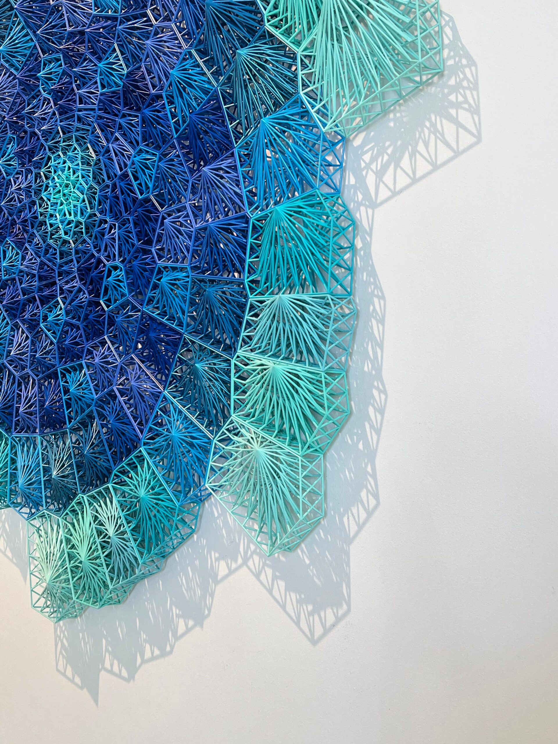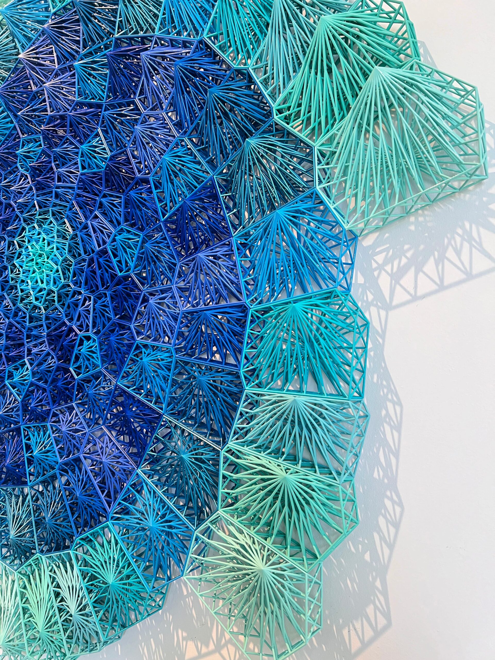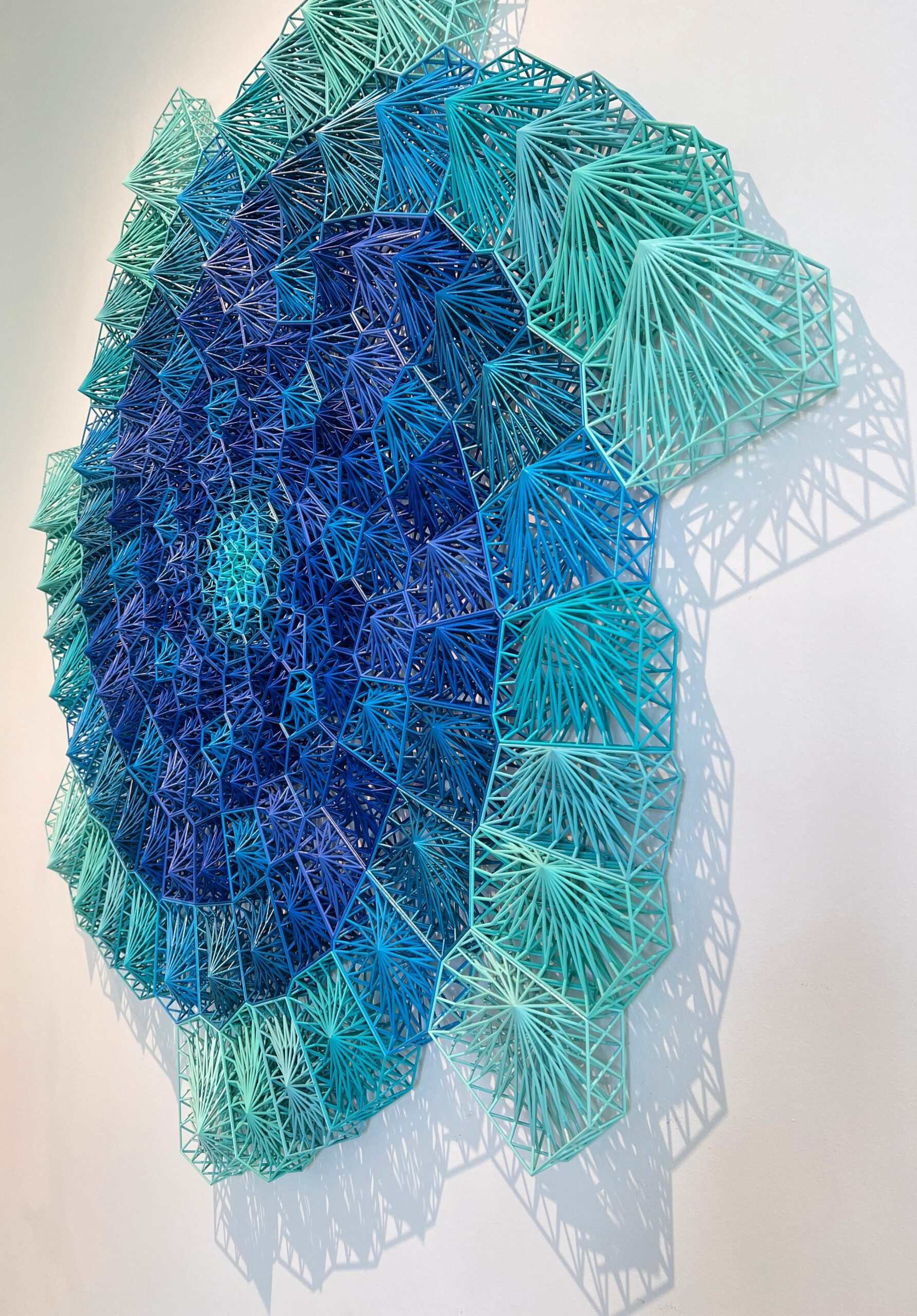 The use of color, from deep fluorescent ink blues to serene seafoam aquas, intensifies the oceanic feel of the sculpture. The gradient is as seamless and dynamic as the natural waves the piece evokes, with the wire forms resembling the peaks and troughs of a wave in mid-crash. The entire piece celebrates the marriage of mathematical beauty and natural wonder, with the Fibonacci algorithm providing both the form and the visual rhythm that pulls the viewer into its mesmerizing complexity.