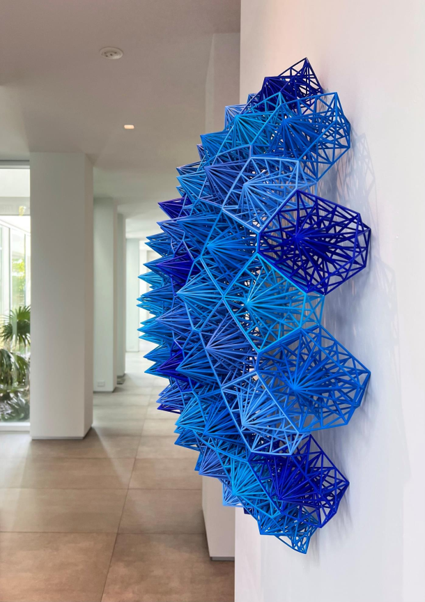 The “Lotus” Wire Art is composed of intricate wire lattice structures arranged in a radial, star-like pattern. Inspired by the natural symmetry of lotus petals, the piece features interwoven polyhedral forms, with each layer expanding outward from the center in a dynamic, three-dimensional bloom. The repeating pentagonal and hexagonal lattice structures, create a sense of balance and harmony. As the organic geometry merges, the artwork feels both futuristic and deeply connected to nature.
