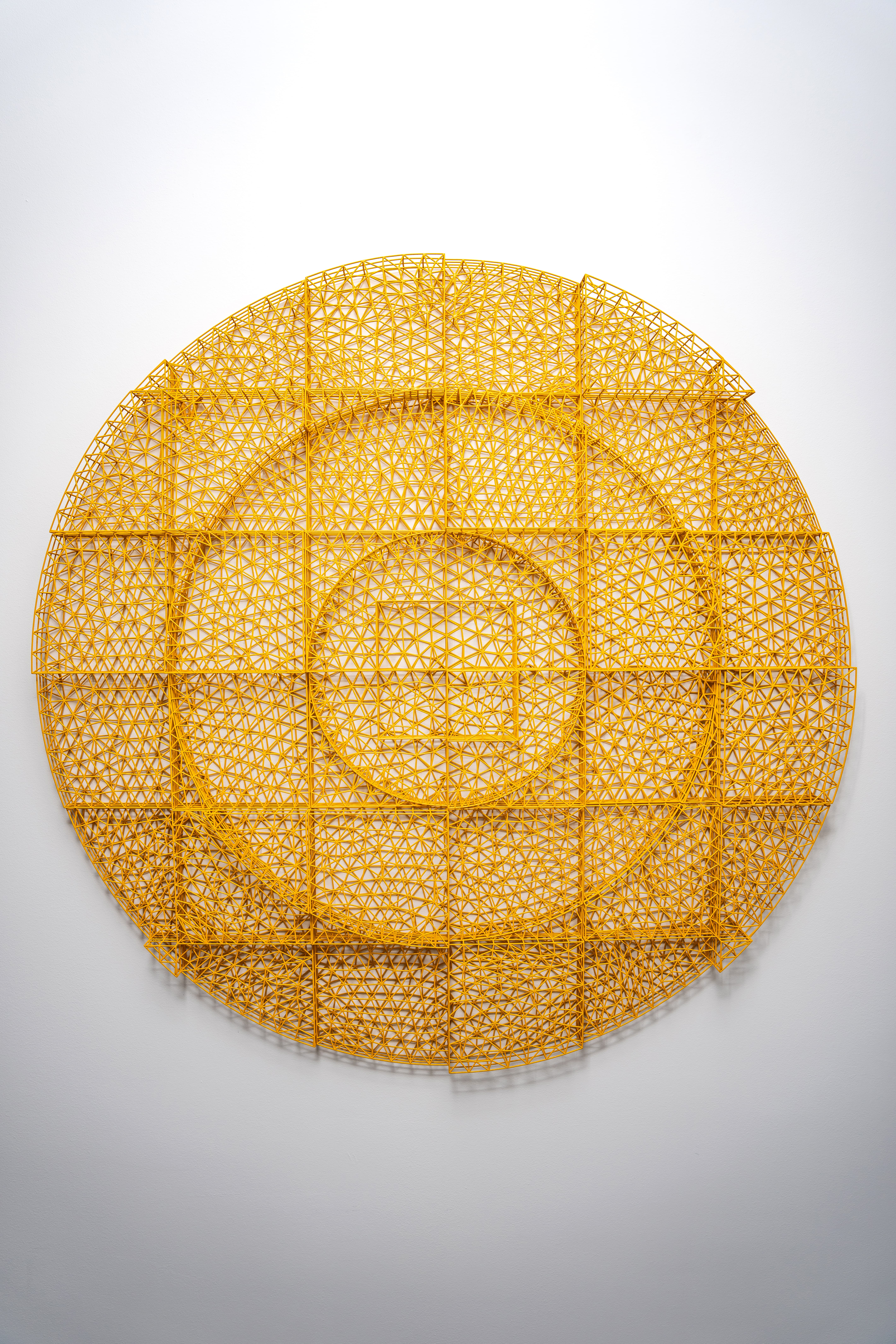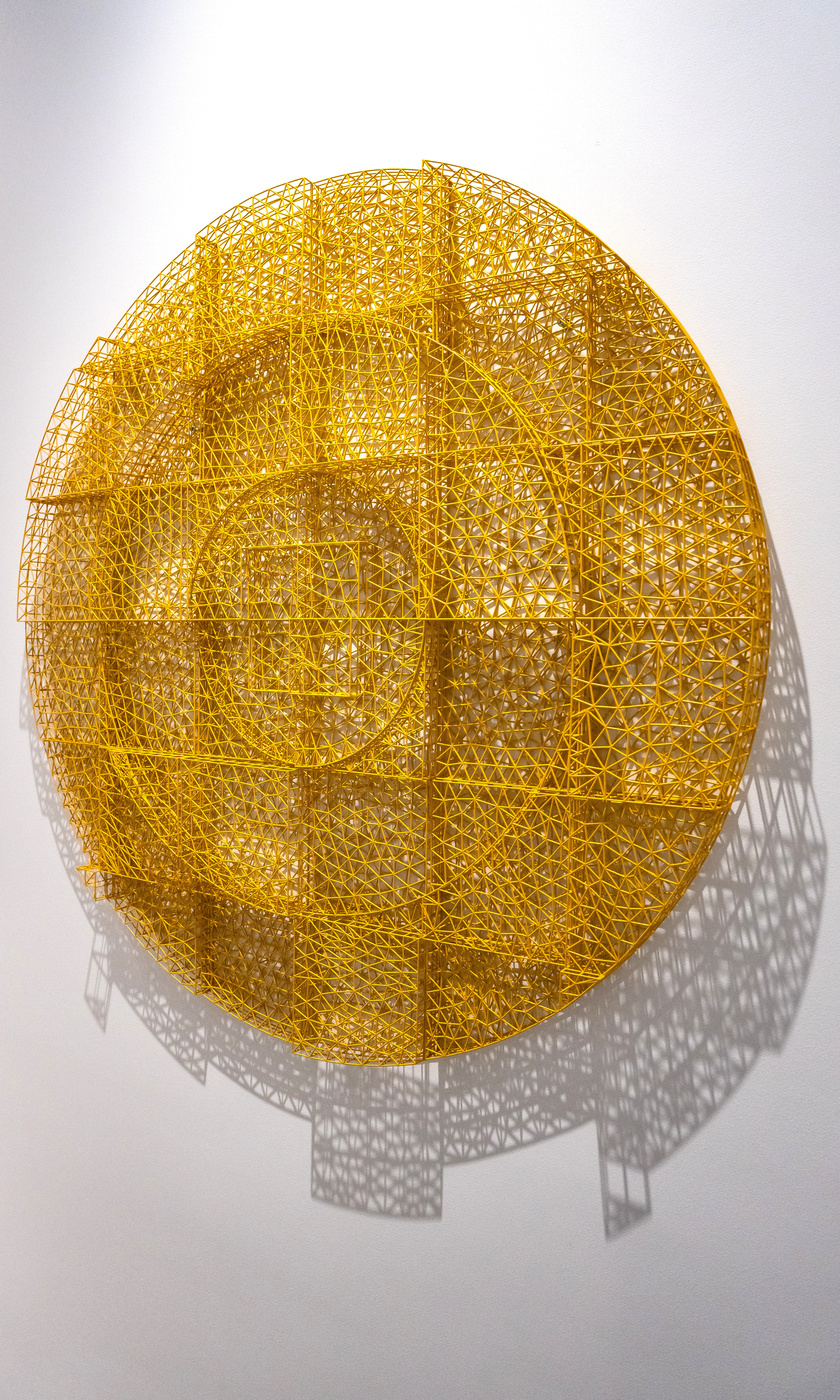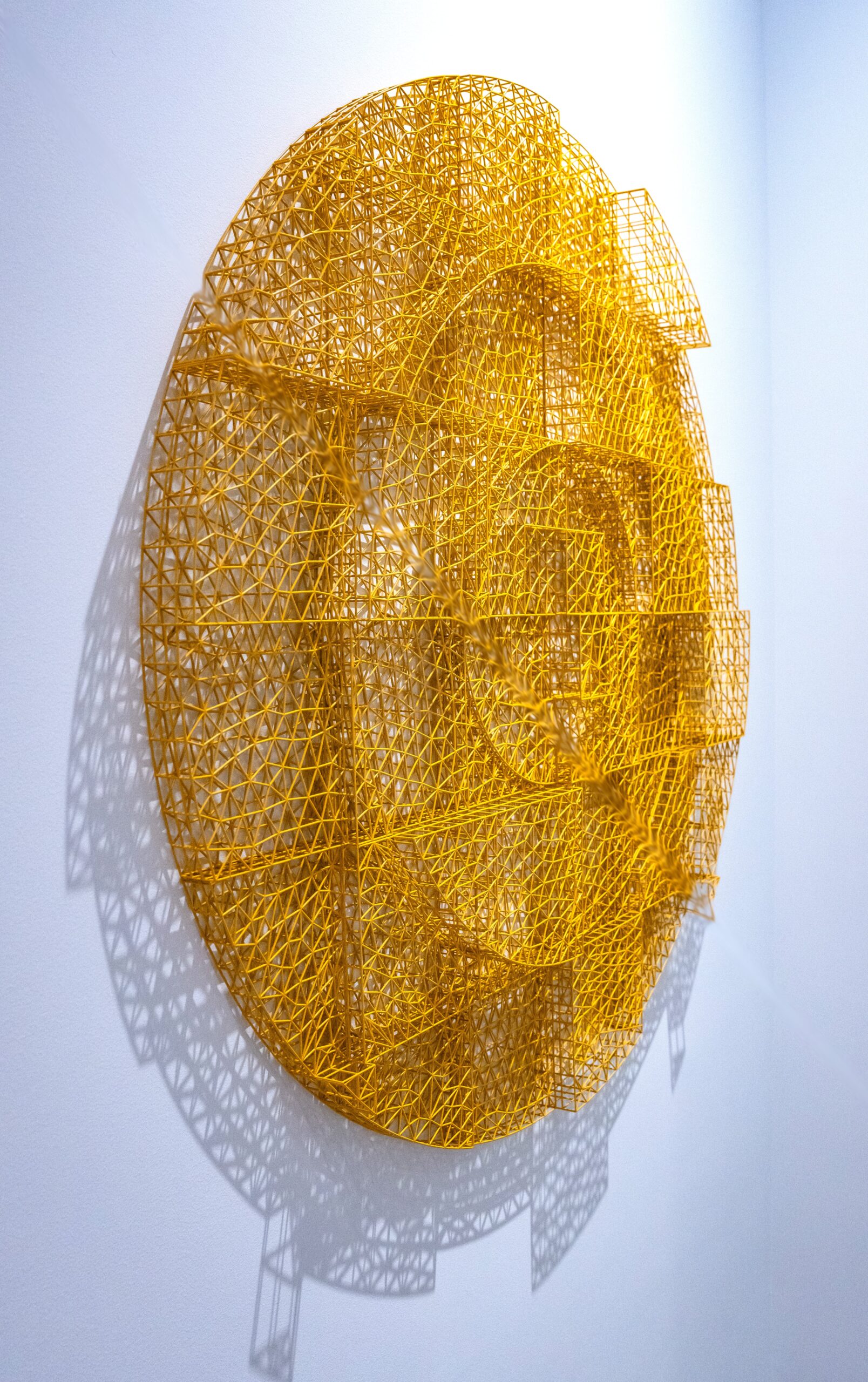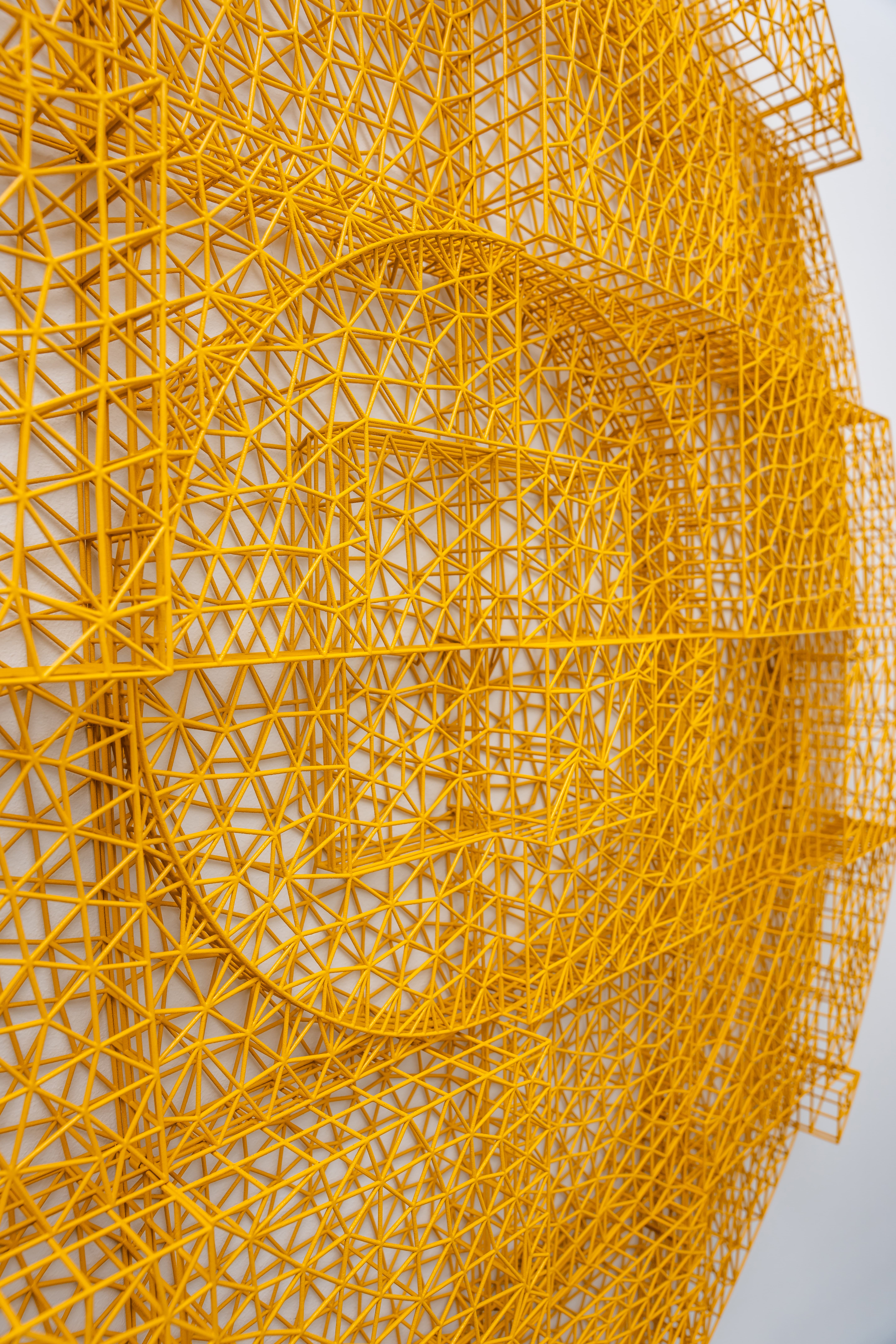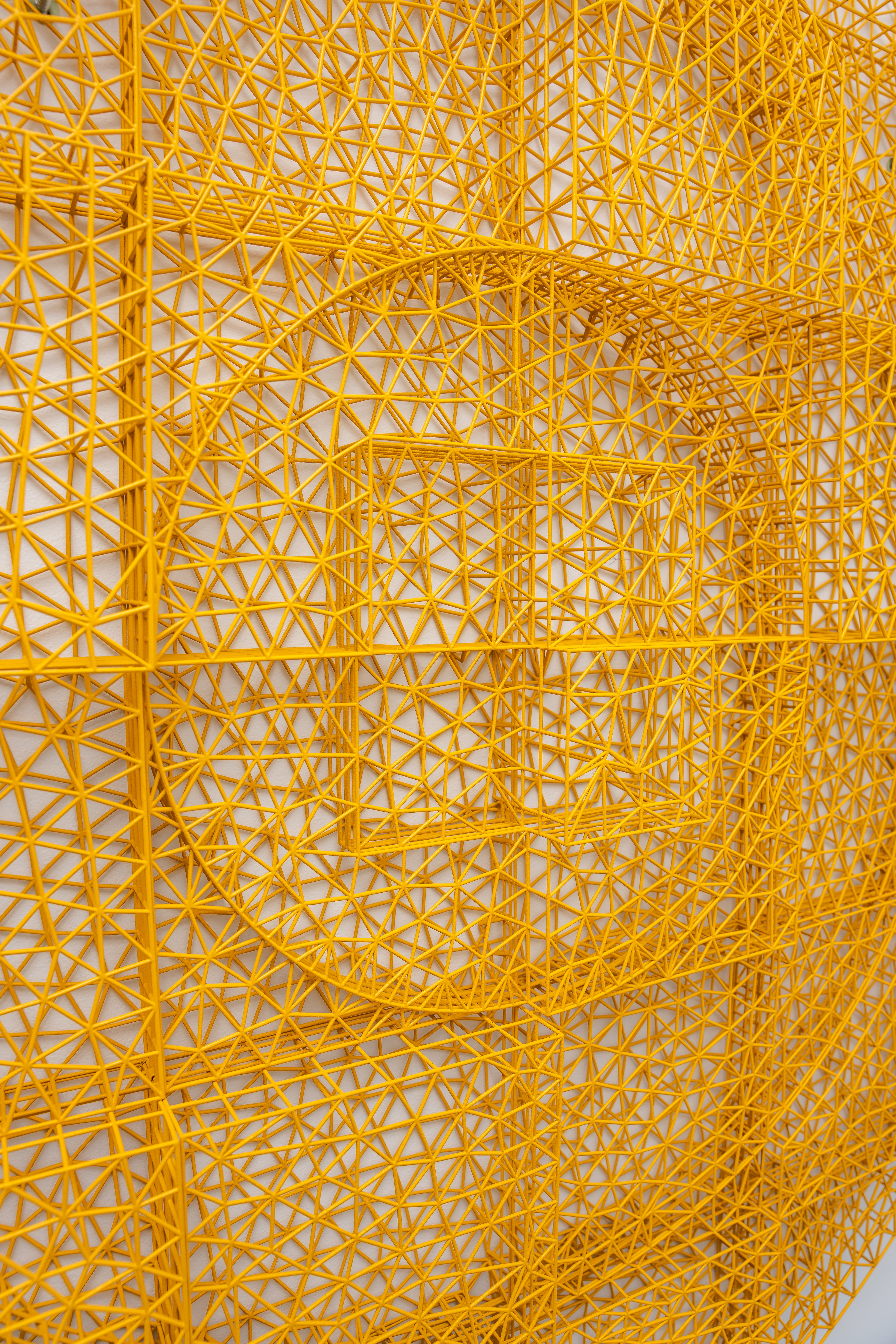The vibrant yellow color of the sculpture enhances its visual impact, symbolizing warmth and energy. The triangular lattice pattern adds a layer of precision and structural integrity, while also allowing the piece to maintain an airy, open feel. This lightness, coupled with the three-dimensional projection from the wall, gives the sculpture a strong presence without feeling heavy or overwhelming.