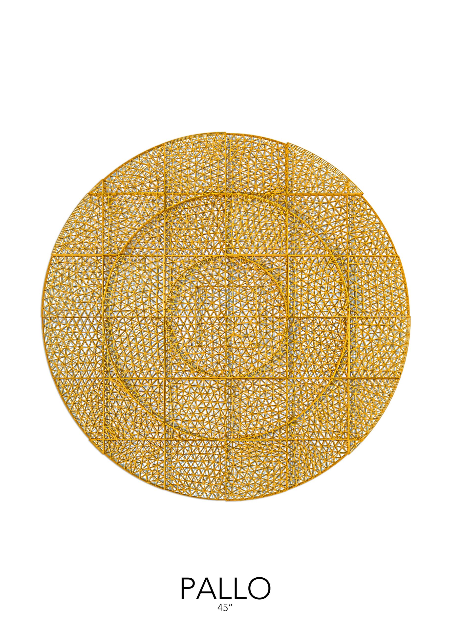 The “Pallo Sunshine Wire Art” wall sculpture is an eye-catching piece, crafted from 3D-printed lattices using triangular geometric algorithms. This radiant sculpture measures 45″ diameter with a 3″ depth, creating an expansive circular form reminiscent of a glowing sun. The design is characterized by a detailed, interconnected lattice of fine wires that are meticulously arranged in a grid-like pattern, forming concentric circular shapes that radiate outward.